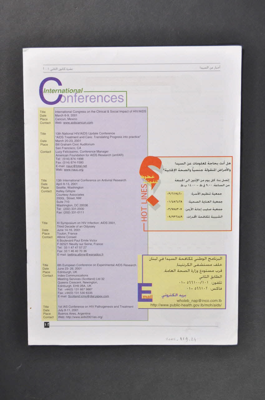 Articles en arabe (traduire les titres). p.7 En anglais : Nouvelles scientifiques : - Nouveau traitement contre le VIH (le Kaletra) - Les femmes séropositives enceintes devraient commencer les traitements antirétroviraux avant 28 semaines En dernières pages : - Données épidémiologiques dans le monde et sans doute au Liban - Calendrier des conférences internationales