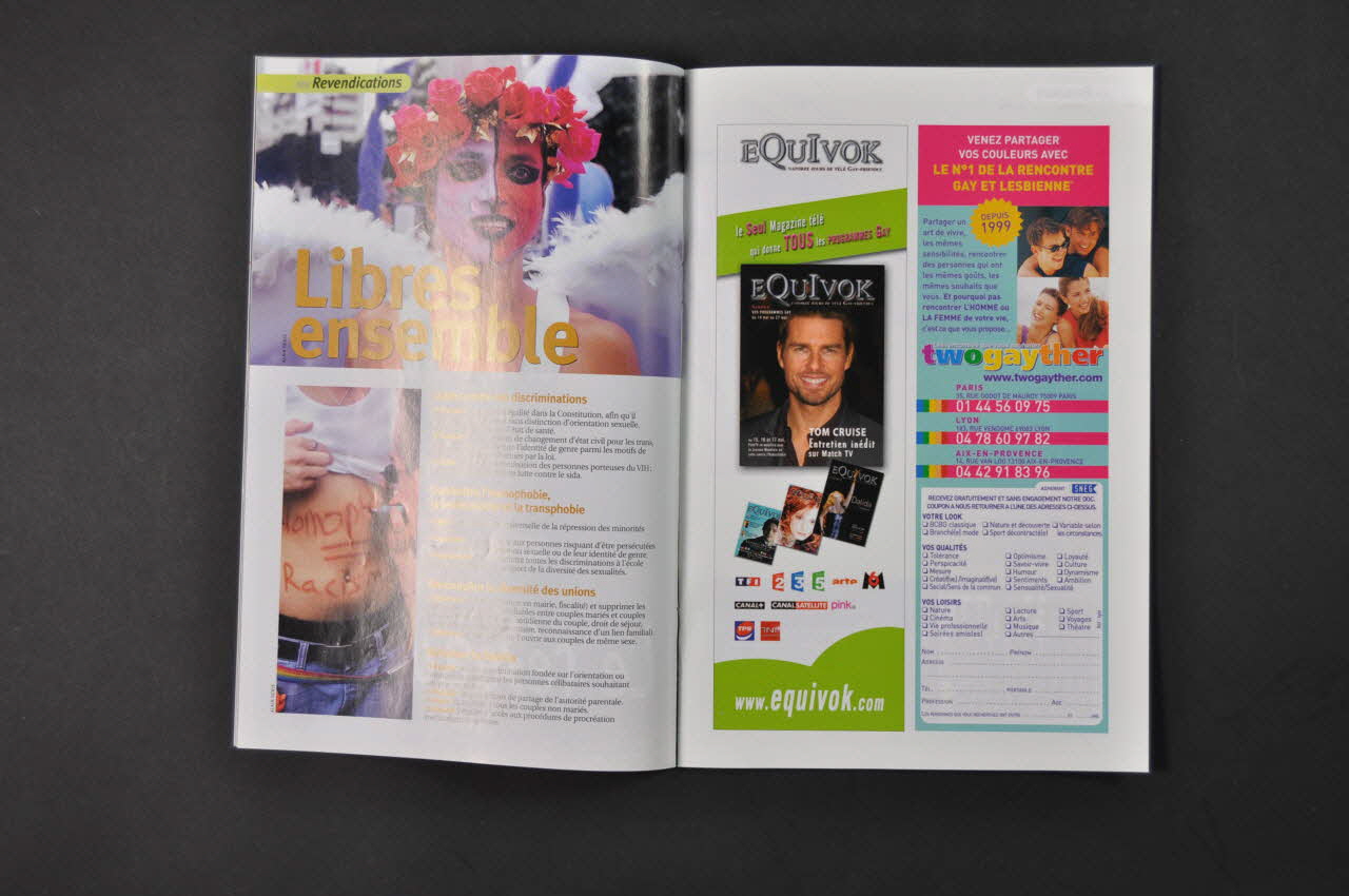 VI Couple // [...] // VIII Homoparentalité // [...] // X Sida // [...] // XIV Revendications // [...] // XVI Parcours // [...] // XVIII Lesbiennes // [...] // XX Trans // [...] // XXVI Evénement // [...] // XXIV World Pride // [...] // XXVI Inter-LGBT // [...] // XXVIII Décryptages (Titres des différents articles inscrit en rose sur la première page), à l'intérieurNom