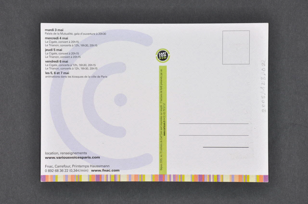 Au centre du verso, une bande verte, que surplombe le logo de l'imprimeur, sépare le verso en deux. La droite du verso est consacrée aux emplacements pour le timbre et l'adresse. A gauche, une sous-impression d'une partie du logo de l'organisateur sert de fond.