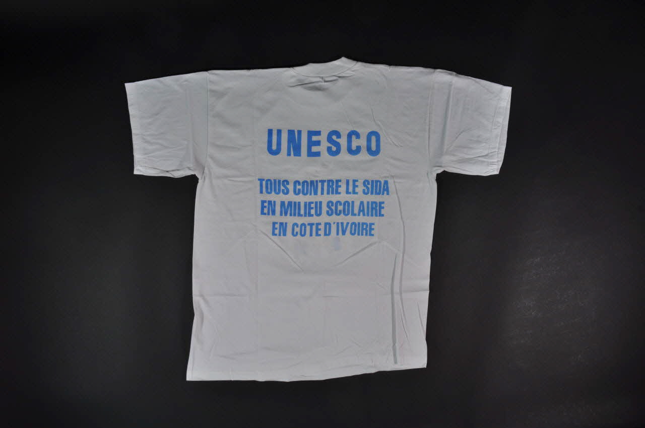 Sur l'avant est imprimée une carte de la Côte d'Ivoire, cernée de noir. A l'intérieur de la carte figure un groupe de personnages : quatre enfants, garçons et filles, en uniforme, cartable sur le dos, sont encadrés par deux professeurs, un homme et une femme. Ils lèvent tous la main vers le haut de la carte où un trou est traversé par les mots : "Sida dehors", expulsant une boule rouge à piquants sur laquelle est écrit en caractères noirs : HIV VIH SIDA.