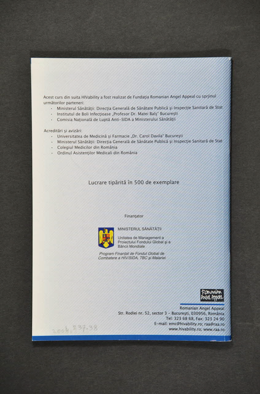 Romanian Angel Appeal // Str. Rodiei nr. 52, sector 3 - Bucuresti, 030956, România // Tel: 323 68 68, Fax: 323 24 90 // E-mail: emc@hivability.ro; raa@raa.ro // www.hivability.ro; www.raa.ro (Dans la partie inférieure droite, en caractères noirs), versoDécor