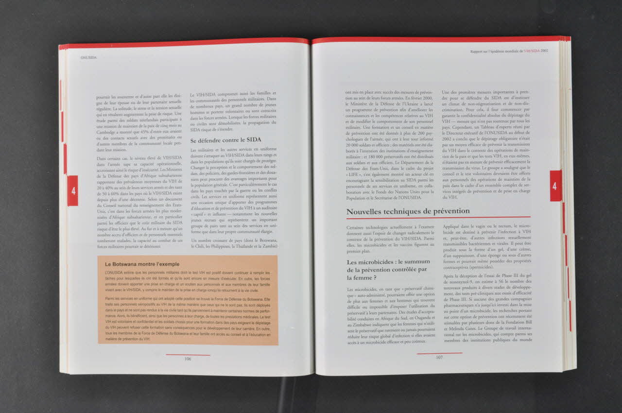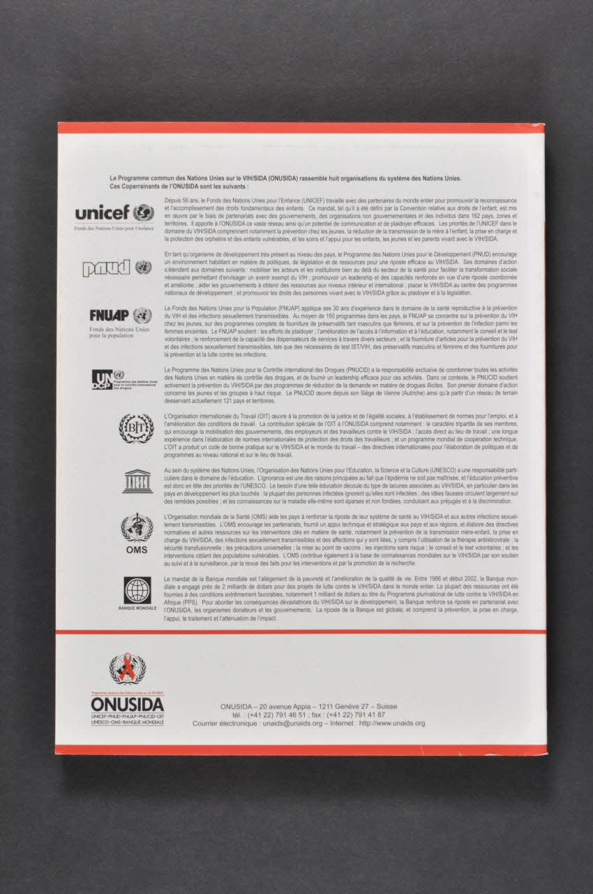 Au revers liste et présentation des organismes membres d'ONUSIDA. En bas logo et coordonnées de l'organisation. Intérieur : impression en noir sur fond blanc. Filets rouges en haut et en bas, avant le numéro de page. Encarts et tableaux fond orange. Numéros des chapitres en blanc sur fond rouge à l'extérieur des pages, présentés en dégradé formant index. Chaque titre de chapitre est présenté sur une page indépendante dont le fond en haut est orange et en bas est blanc. Photo noir et blanc en sous impression à cheval sur les deux fonds. Certaines de ces photos reprennent des illustrations de la couverture. En surimpression, en caractères blancs, le titre du chapitre.Inscriptions