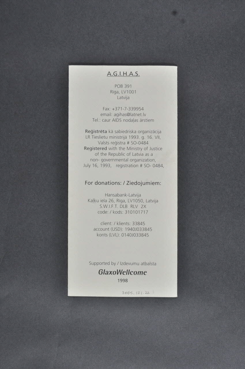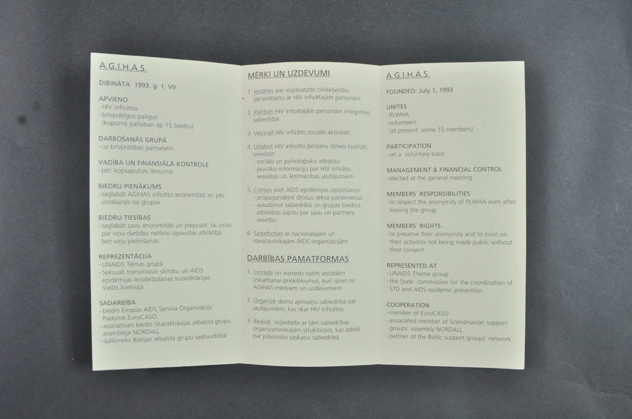 Atbalsta Grupa Inficetajiem ar Hiv un Aids Slimniekiem // // AGIHAS // // Support Group for People Living With HIV/AIDS (Imprimé en capitales noires), rectoDate