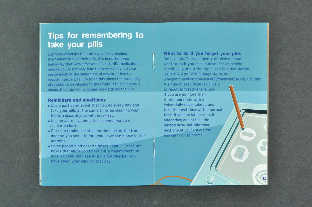 Contents // 6 What are the difficulties? // 8 Taking your pills at work // 12 Tips for remembering to take your pills // 14 Dealing with side effects // 16 Telling your emlployer and work // colleagues // 19 Reasonable adjustments // 20 More help and advice (Le sommaire est marqué en blanc et numéroté en jaune.), à l'intérieurLogo, numéro, adresse, nom d'association