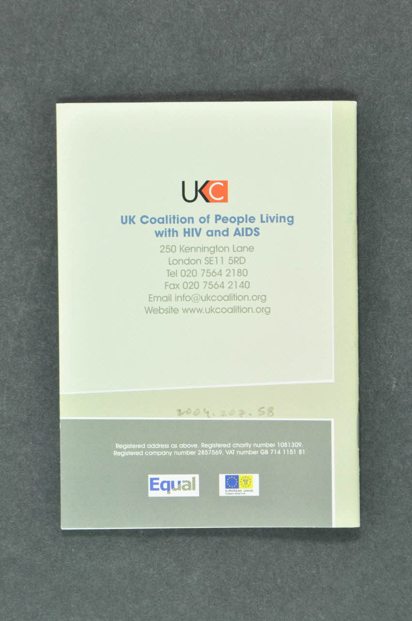UKC // UK Coalition of People Living // with HIV and AIDS // 250 Kennington Lane // London SE11 5 RD // Tel 020 75642180 // Fax 020 7564 2140 // Website www.ukcoalition.org (L'inscription est imprimée en bleu et marron dans la partie supérieure de la quatrième de couverture. // Le logo est formé de trois lettres: deux noires, une blanche inscrite dans une petite languette orange.), sur la couvertureTexte