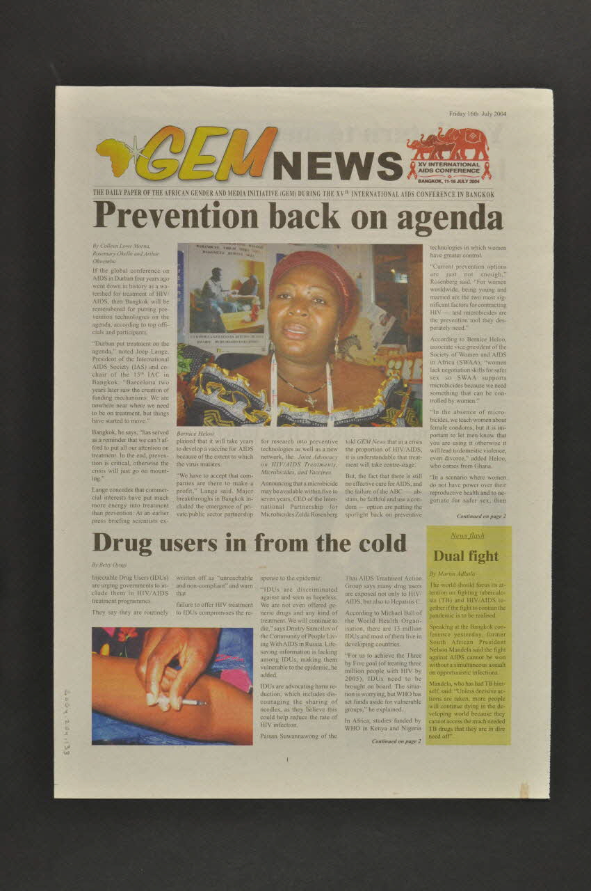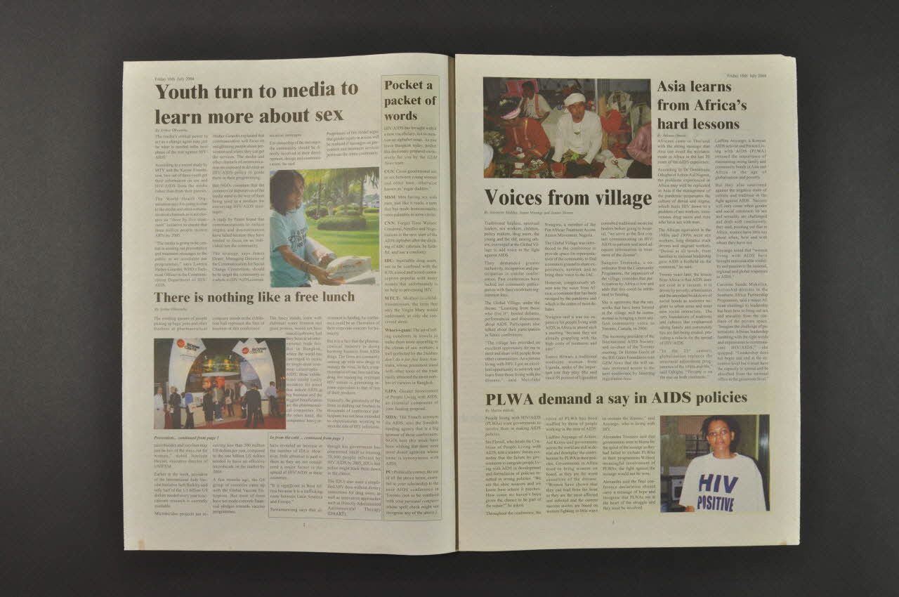 De forme rectangulaire en papier journal, imprimé en couleur, le journal présente deux côtés : l'un imprimé en anglais, l'autre imprimé en français.
