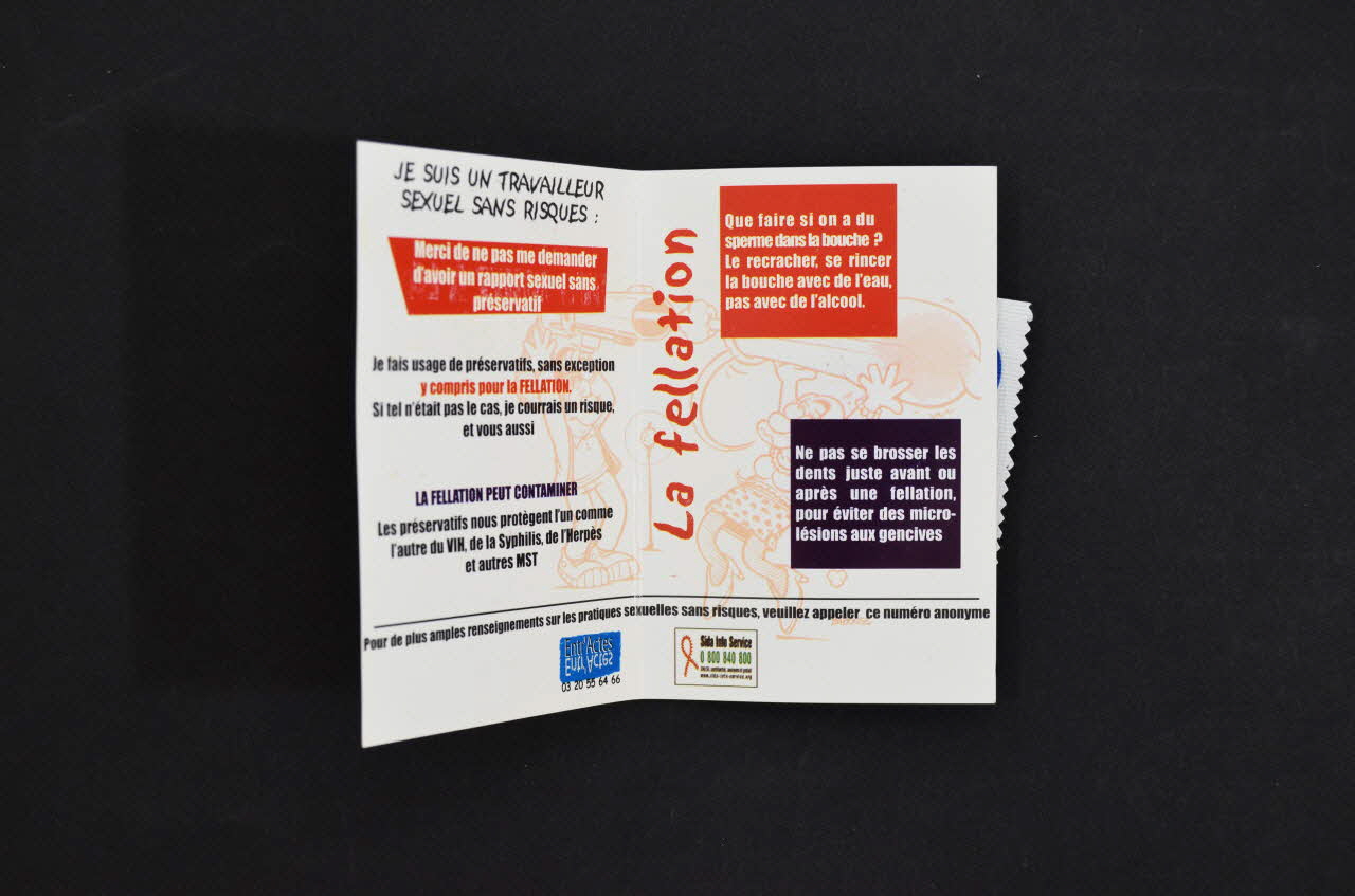 Cf affiche 2005.12.8 / Feuillet de gauche .En capitales italiques noires :"Je suis un travailleur sexuel sans risques". En dessous, en blanc sur bandeau rouge :"Merci de ne pas me demander d'avoir un rapport sexuel sans préservatif" En dessous, en caractères noirs :"Je fais usage de préservatifs, sans exception / (en rouge) y compris pour la fellation / (en noir) Si tel n'était pas le cas, je courrais un risque, / et vous aussi." En dessous, en petites capitales violettes : "La fellation peut contaminer". En dessous, en noir :"Les préservatifs nous protègent l'un comme l'autre du VIH, de la Syphilis, de l'Herpès et autres MST" Feuillet de droite. Verticalement à gauche, en caractères fantaisie rouges : "La fellation". En haut, en blanc sur carré rouge : "Que faire si on a du sperme dans la bouche ? Le recracher, se rincer la bouche avec de l'eau, pas avec de l'alcool" En bas, en blanc sur carré violet : "Ne pas se brosser les dents juste avant ou après une fellation, pour éviter des microlésions aux gencives" Tout en bas, sur les deux feuillets : "pour de plus amples renseignements sur les pratiques sexuelles sans risques, veuillez appeler ce numéro anonyme : logos de Entr'Actes et de Sida Info Service. Une enquête d'évaluation faite par l'association a montré que le volet de gauche a été très apprécié par les prostituées qui disaient les brandir devant leurs clients, un peu comme signe d'identité revendiquée, sans avoir à prononcer une parole.