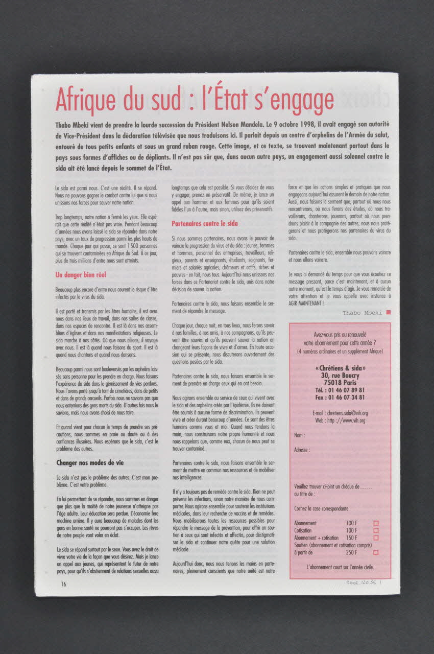 ouverture // contre le silence // // expériences // Cameroun, Sénégal, Mozambique, Zimbabwe... // // Pierre Faure // regarder le sida à la lumière de l'Evangile // // débat // Antoine Lion, Jean-Loup Rey, Damien Rwegera // nouvelles thérapies ou prévention: l'impossible choix // // mosaïque // Thabo Mbeki // Afrique du sud, l'Etat s'engage (En première page)Date