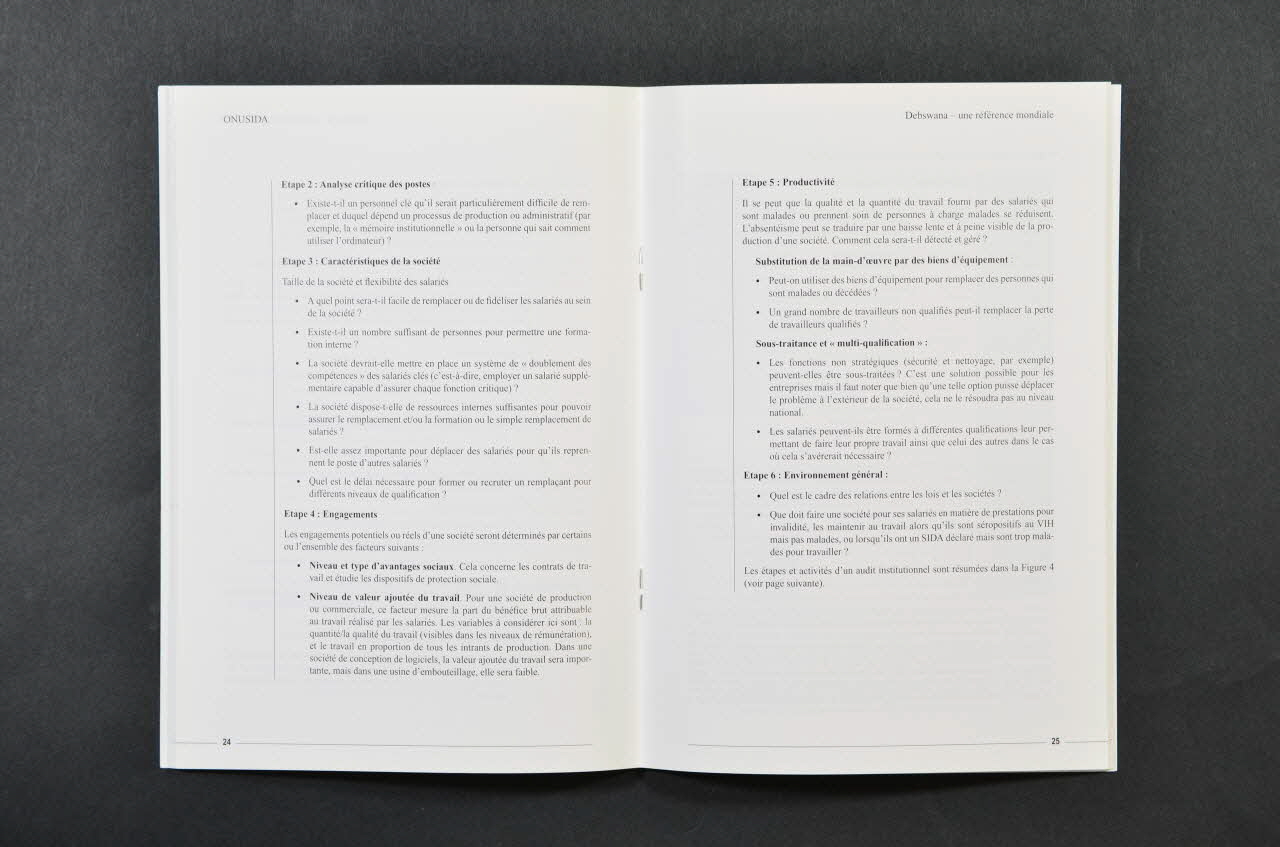 Sommaire - p.4 Préface - p.5 1. Introduction Le VIH-Sida au Botswana La riposte au VIH-SIDA - p.14 2. L'économie botswanaise - p.17 3. La Debswana Diamond Society - p.18 4. Les premières années : Sensibilisation et éducation en matière de Sida / Nomination de coordinateurs du programme de lutte contre le SIDA à plein temps /Elaborationd'une politique de gestion du VIH/SIDA / Etude de prévalence / La société réalise un dépistage avant d'investir sur les jeunes - p.21 5. L'audit institutionnel : Généralités / L'audit institutionnel sur le VIH/sida, un processus en six étapes / Résultats de l'audit / Problèmes de collecte des données / Présentation des conclusions / Recommandations à l'attention du Comité exécutif - p.34 6. Les enseignements retenus : Le fourniture de médicaments antirétroviraux / L'assurance des entreprises collaboratrices / Le processus d'identification des postes critiques / La nouvelle stratégie de lutte contre le VIH/sida /L'élaboration d'une norme de compétence en matière de sida pour les directeurs / L'élaboration d'une norme de gestion du VIH/sida - p.43 7. Actualisation de l'étude 2001 - p.44 8. L'avenir : quels sont les enseignements que les autres organisations et sociétés privées peuvent tirer de l'expérience de Debswana ? - p.48 9. Références bibliographiques