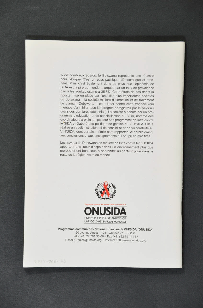 La couverture présente, en haut, une bande horizontale noire et grise traversée à gauche par une bande verticale de pointillés gris. Sur la gauche, on trouve la photographie de deux femmes et d'un homme noirs. En dessous, il y a trois carrés dans lesquels on trouve trois rubans rouges. En bas, à droite, un logo est illustré à l'intérieur d'un carré. Il représente d'un globe du monde et d'un ruban rouge entouré de deux couronnes de feuilles. Ce même logo est représenté au dos de la brochure dans le bas de la page, en dessous d'un texte. L'intérieur est composé de textes sous forme de paragraphes accompagné d'illustrations de plusieurs graphiques.Inscriptions