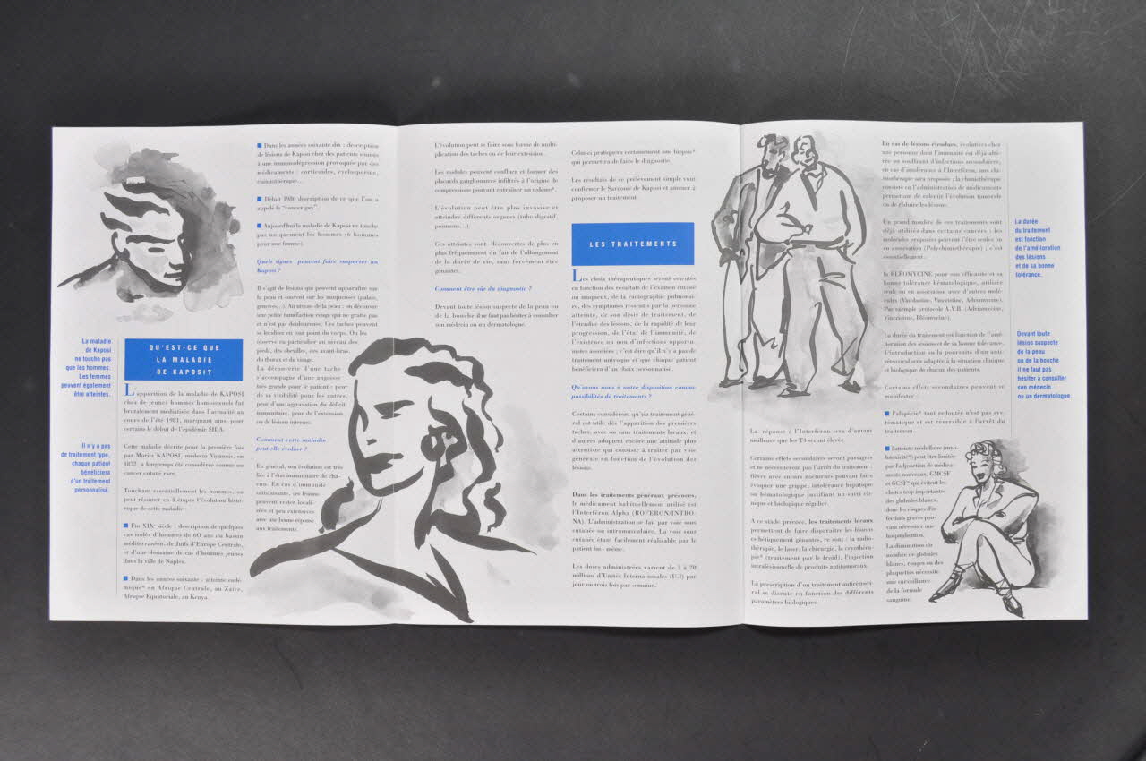 - p.2 Qu'est-ce que la maladie de Kaposi ? Quels signes peuvent faire suspecter un kkaposi ? / Comment cette maladie peut-elle évoluer ? / Comment être sûr du diagnostic ? - p.3 Les traitements - p.4 Quelles sont les voies de recherche ? - p.4 Conclusions : "Actuellement, le Sarcome de Kaposi ne doit plus être présenté ni vécu comme une étape obligatoire de la dégradation immunitaire. Des traitements adaptés à chacun sont accessibles en tenant compte de la localisation et de l'extension des lésions." - p.5 Pour en savoir plus : documents édités par l'association, minitel, les comités régionaux.