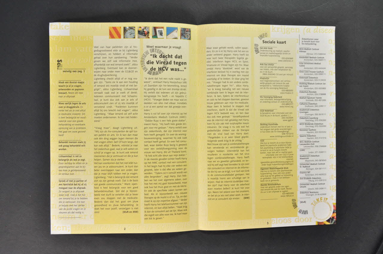 Sommaire - p.1 Annonce du contenu du numéro : " Vragen, maar hoe ? Zorg dat je goed wordt voorgelicht" (traduction) - p.1-2 De deskkundige : Aidsconsulent spil tussen patient en arts :"We zijn niet helderziend" - p.1-2 Tips - p.2 et 3 Interview : "Ik dacht dat die Viread tegen de HCV was..." - p.3 Adresses utiles. - p.4 Interview : Twee grote ego's
