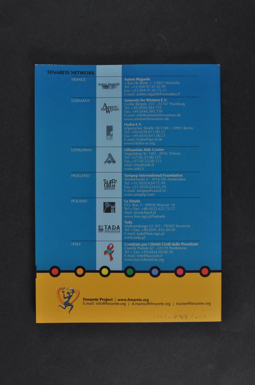 Au revers, liste du "Fenerate Network" avec contacts d'association en France (Autres regards), Allemagne (Amnesty for Women, Hydra), Lituanie (Lithuanian AIDS center), Pays Bas (Tampep International Foundation), Pologne (La Strada , Tada), Italie (Comitato per i Diritti Civili delle prostitute). En bas, bandeau orange avec logo et coordonnées du projet.Inscriptions