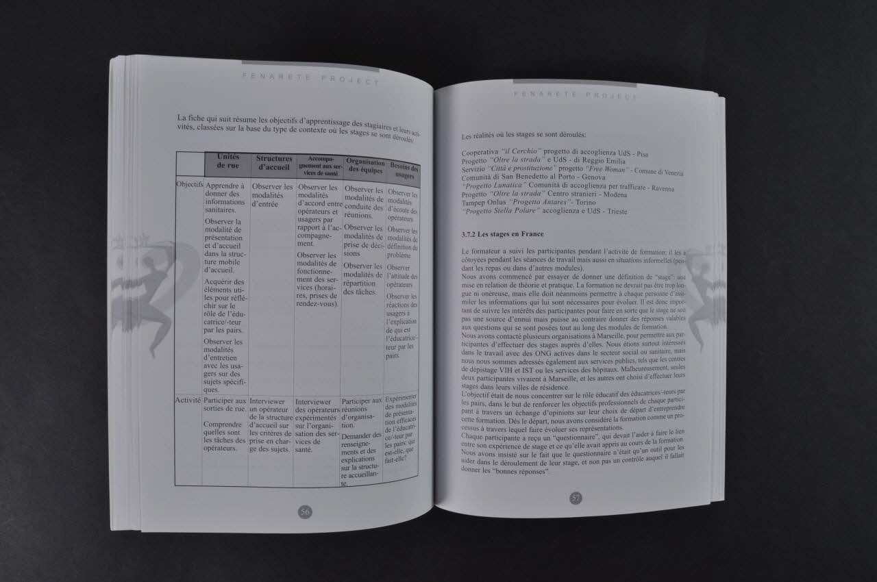 Livre de 120 pages à couverture souple. Fond bleu avec en bordure supérieure, inscription "Fenare Project" surplombant un motif de femme stylisée courant devant un coeur orange. En surimpression titre et éditeur : "Formation Professionnelle pour Pairs Educatrices et Milieu Prostitutionnel - Edité par Pierfranca Borlone et Grazia Macchieraldo." En bas, bandeai orange délimitée par une ligne fléchée à points multicolores avec ensemble de six logos.