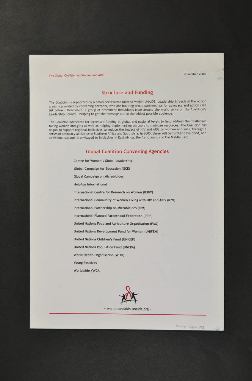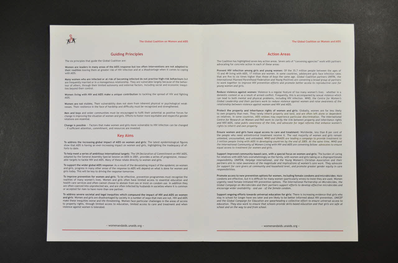 Sur la couverture en haut, à gauche, il y a le logo de la coalition (deux femmes autour d'un ruban rouge) et à droite, en petits puis gros caractères noirs il y a le titre en anglais. En dessous, encadré de rouge, on peut lire en anglais la définition de la coalition. Au bas de la page il y a l'adresse du site de la coalition et un trait rouge. A l'intérieur, le fond est blanc avec des impressions en noir et les sous titres en rouge. L'adresse du site est en bas de chaque page comme le titre de la brochure en haut. En dernière page sont nommées les organisations internationales et agences partenaires de l'ONU. Il y a aussi la date de la manifestation et en bas le logo de la coalition ainsi que l'adresse.Inscriptions