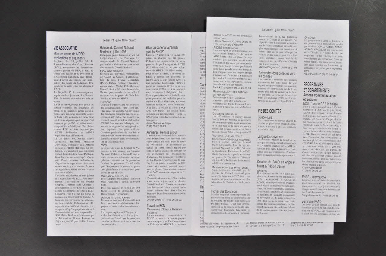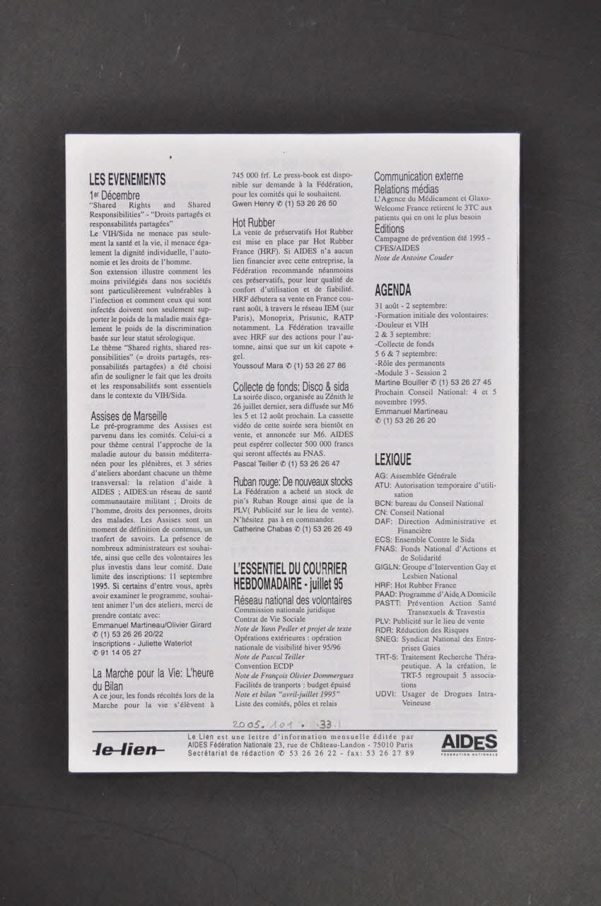 VIE ASSOCIATIVE p.2-3 // Mise en cause de AIDES // Retours du Conseil National // [...] // // VIE DES COMITES p.3 // Guadeloupe // [...] // // PROGRAMMES ET DEPARTEMENTS // Action Communautaire // et Sociale p.3-4 // [...] // Action Thérapeutique p.4 // [...] // Action Internationale p.4 // (...) // Administration // et Finances p.4-5 // [...] // Information-Communication // Action Publique p.5 // [...] // Editions p.5 // (...) // // LES EVENEMENTS p.6 // 1er décembre // [...] // // L'ESSENTIEL DU COURRIER // HEBDOMADAIRE p.6 // AGENDA p.6 // LEXIQUE p.6 (sur la première page), à droiteDécor