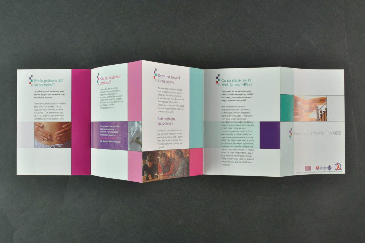 L'intérieur du dépliant comporte des inscriptions en diverses couleurs sur fond blanc. Des bandes de couleur ainsi que des petites photographies couleur se trouvent sur la plupart des feuillets.