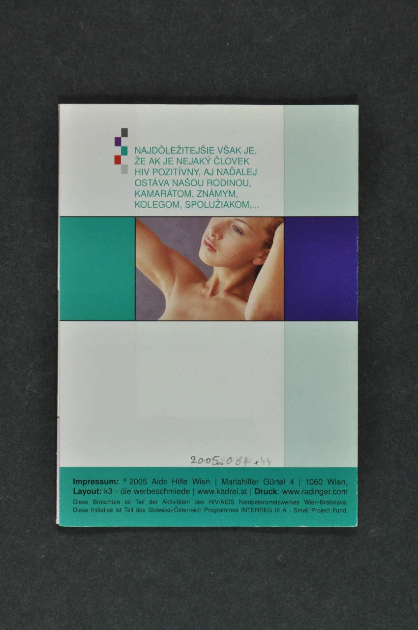 Le dos de la brochure comporte un fond blanc agrémenté d'un encart vert à gauche. Au centre, une vignette comporte une photographie couleur représentant une femme bras levés. Au dessus, se trouve un texte en petites capitales vertes. Un bandeau vertical vert clair, violet, vert clair figure à droite et un bandeau vert avec des inscriptions en noir est situé en bas.