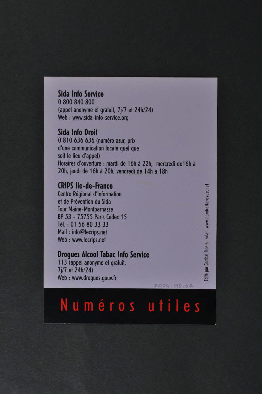 Le recto présente un fond rouge avec du texte imprimé en grands caractères noirs dans la partie supérieure et quelques mots plus petits dans le bas. Le verso comprend, sur fond taupe, les coordonnées de quatre associations : Sida Info Service, Sida Info Droit, CRIPS Ile-de-France, Drogues Alcool Tabac Info Service. Dans le bas se trouve un bandeau noir contenant du texte imprimé en rouge. Sur le bord droit, une ligne de texte est imprimée verticalement.Inscriptions