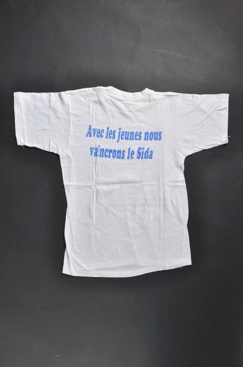 Tee shirt blanc à manches courtes et encolure ronde, présentant sur l'avant, en haut, à droite le logo du Programme. Au centre, une carte de la Guinée est parsemée de croix avec un rond au centre de couleur rouge (une légende explique qu'il s'agit du virus du sida). En dessous, en noir figure une légende.