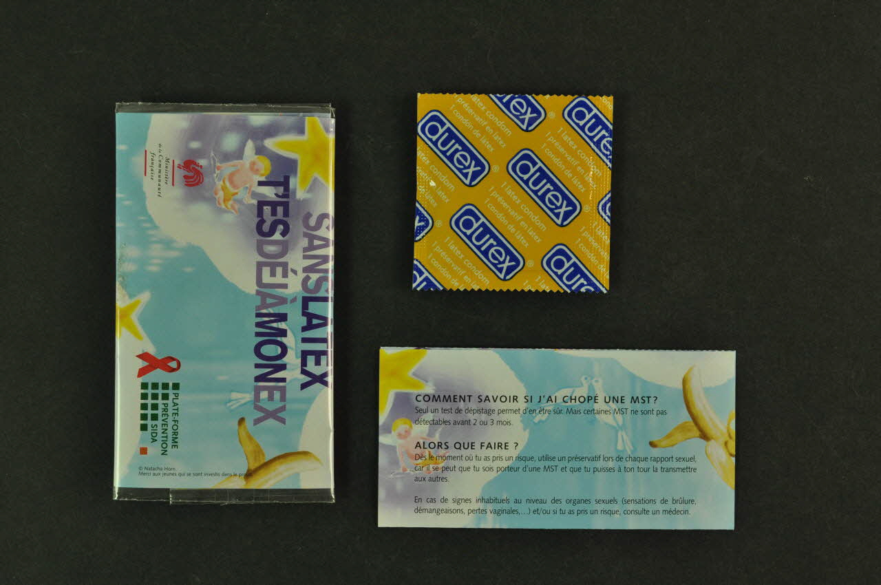 Le papier sur fond violet est un dépliant avec plusières inscriptions sur les deux faces. La couverture présente sur le fond des dessins d'étoiles jaunes et angelots sur fond bleu ainsi qu'un dessin violet en forme de préservatif, avec une inscription en blanc. Le dos de couverture présente des inscriptions en capitales violet, en haut. Il a le même fond avec des étoiles et un angelot ainsi qu'une banane. En bas à gauche il y a un ruban rouge, à côté des petits carrés verts, et à droite du cela des inscriptions en vert. Au fond à droite on trouve un logo en forme de coq en rouge, avec des inscriptions en bas.Inscriptions
