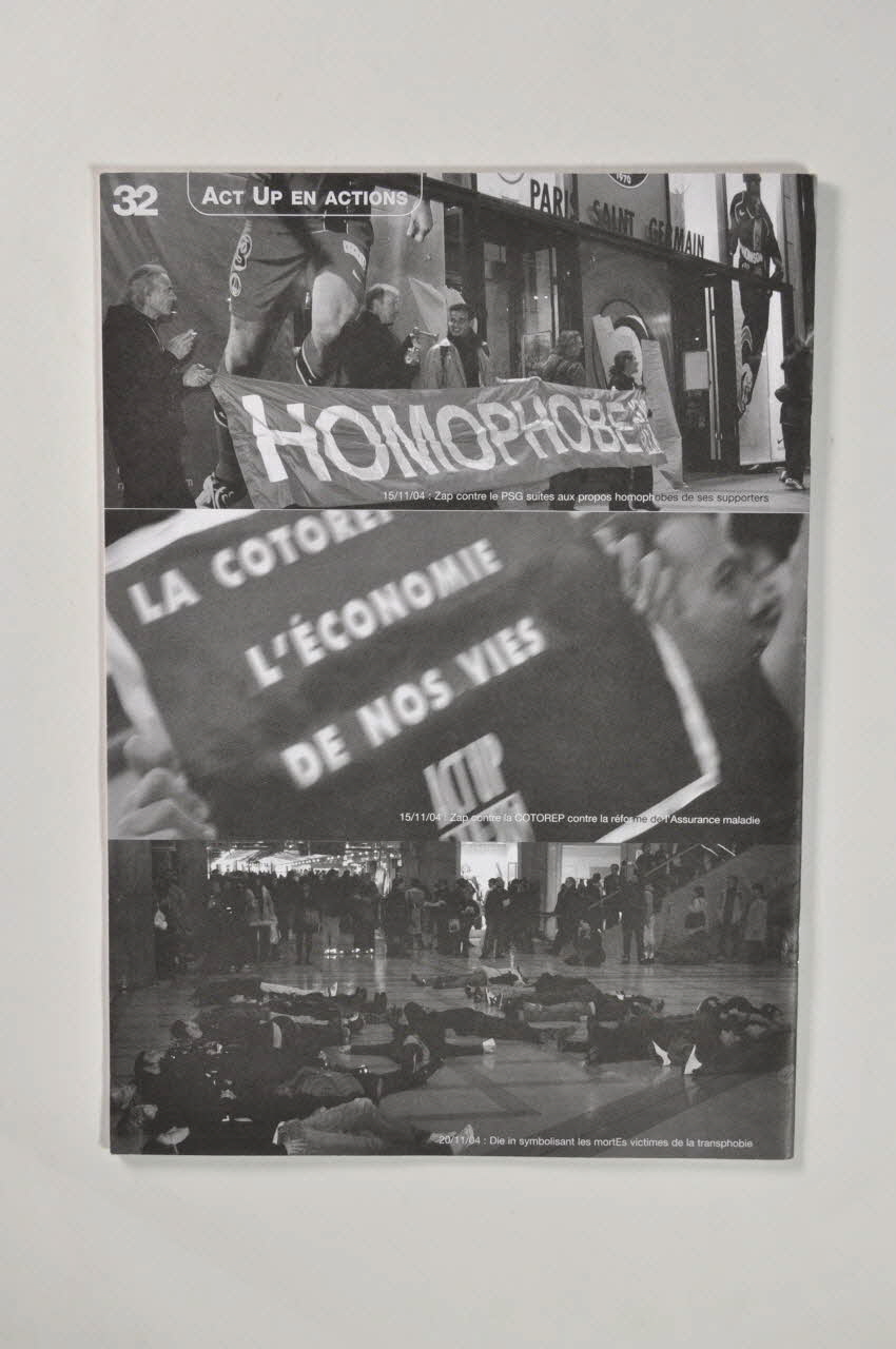 15/11/04: Zap contre la COTOREP contre la réforme de l'Assurance maladie (En bas de la deuxième photographie), verso15/11/04: Zap contre le PSG suites aux propos homophobes de ses supporters (En bas de la première photographie), verso20/11/04: Die in symbolisant les mortEs victimes de la transphobie (En bas de la troisième photographie), versoTitre, numéro, date