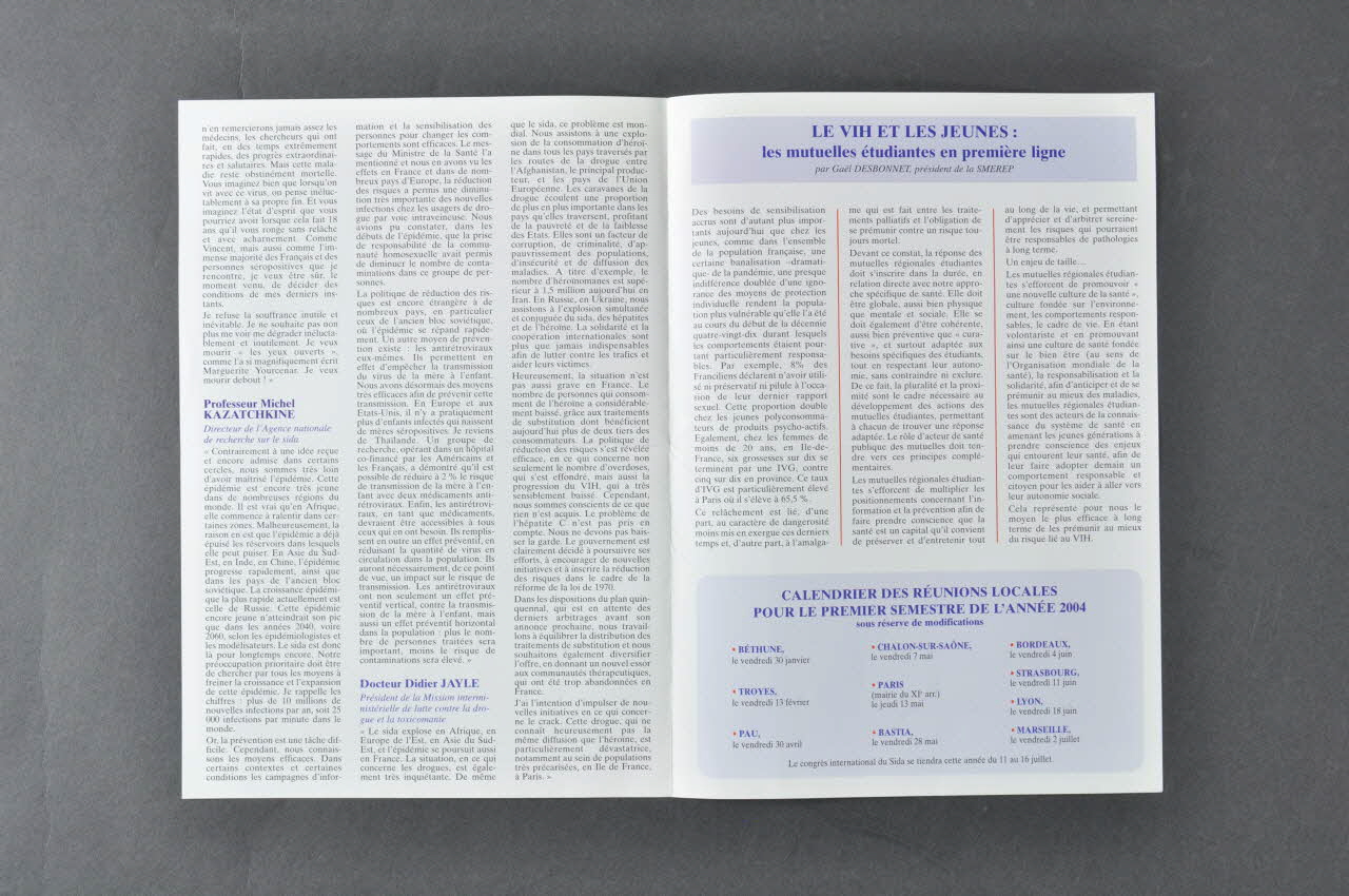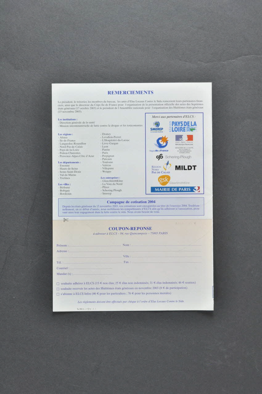 La couverture présente en haut sur un bandeau gris le logo de l'association suivi du titre du bulletin en blanc et rouge, de la date en petits caractères et, en bleu, d'un slogan. La première page présente des morceaux choisis des Etats Généraux qui se sont tenus le 15 novembre 2003. Extraits d'interventions de Sheila, Romero, Kazatchkine, Didier Jayle. Au centre du journal est glissée une feuille A4, présentant une invitation pour la parution des Actes des 8emes Etats Généraux d'ELCS.Inscriptions