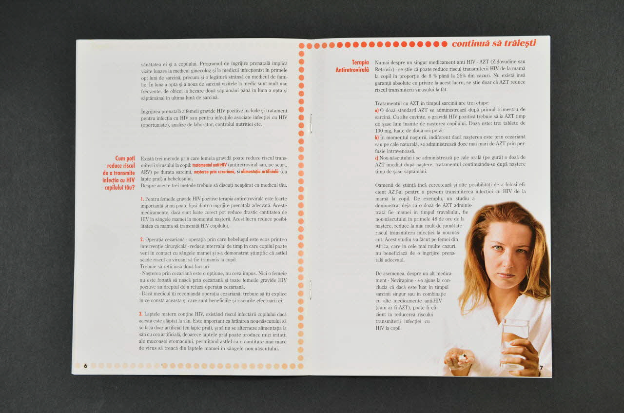 Introducere // Ce sunt HIV si SIDA // Cum se transmite HIB... // Infectia cu HIV nu se transmite... // [...] (Titres des paragraphes imprimés à gauche en rouge sur blanc), à l'intérieurNom d'association