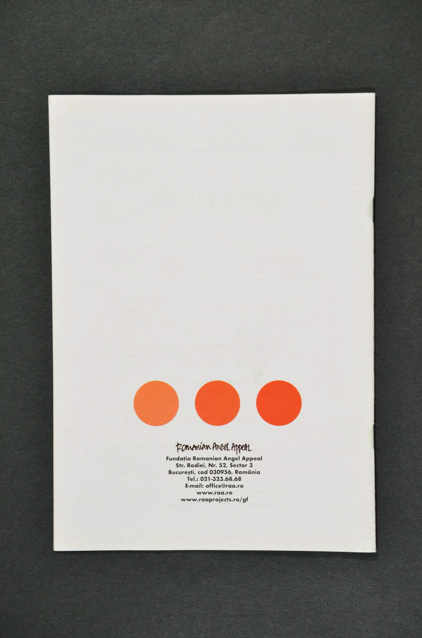Fundatia Romanian Angel Appeal // Str. Rodiei, Nr. 52, Sector 3 // Bucuresti, cod 030956, România (Imprimé en petits caractères noirs sur blanc, dans le bas), versoTexte