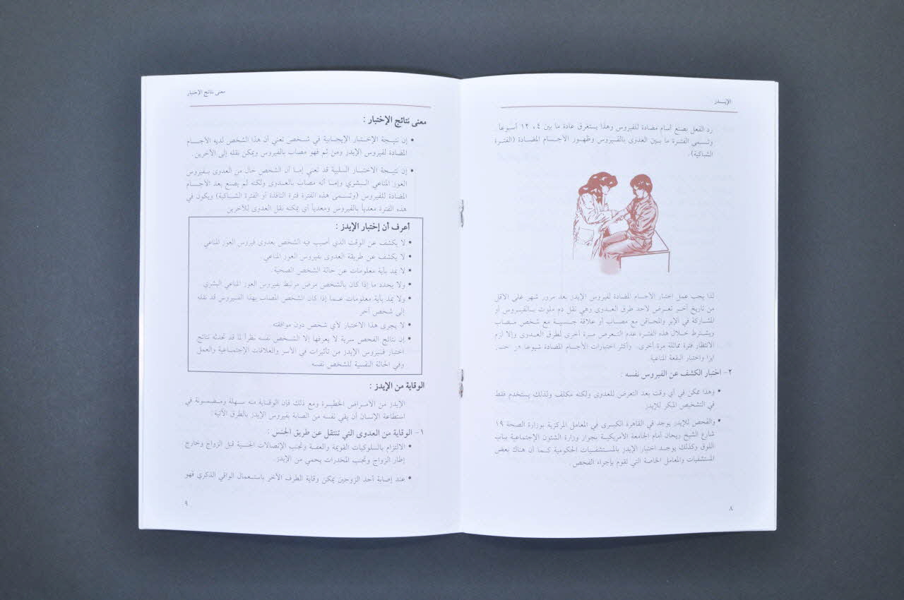 A l'intérieur, le fond est blanc avec le texte en noir illustré de quelques petits schémas sépia sur ce qui transmet le virus (dont la transfusion) et ne le transmet pas.