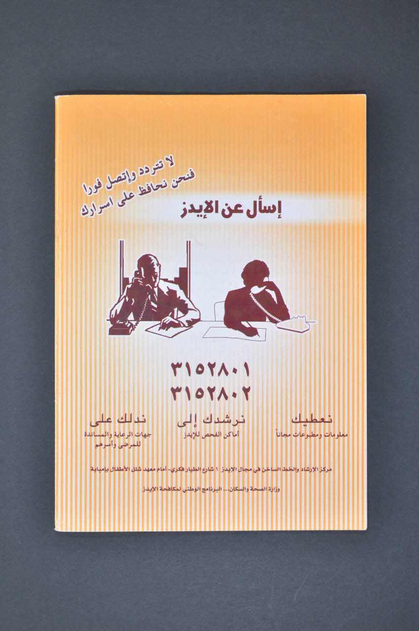 Le dos de la revue a les mêmes rayures avec au centre, deux silhouettes brunes au téléphone encadrés d'un texte en arabe.