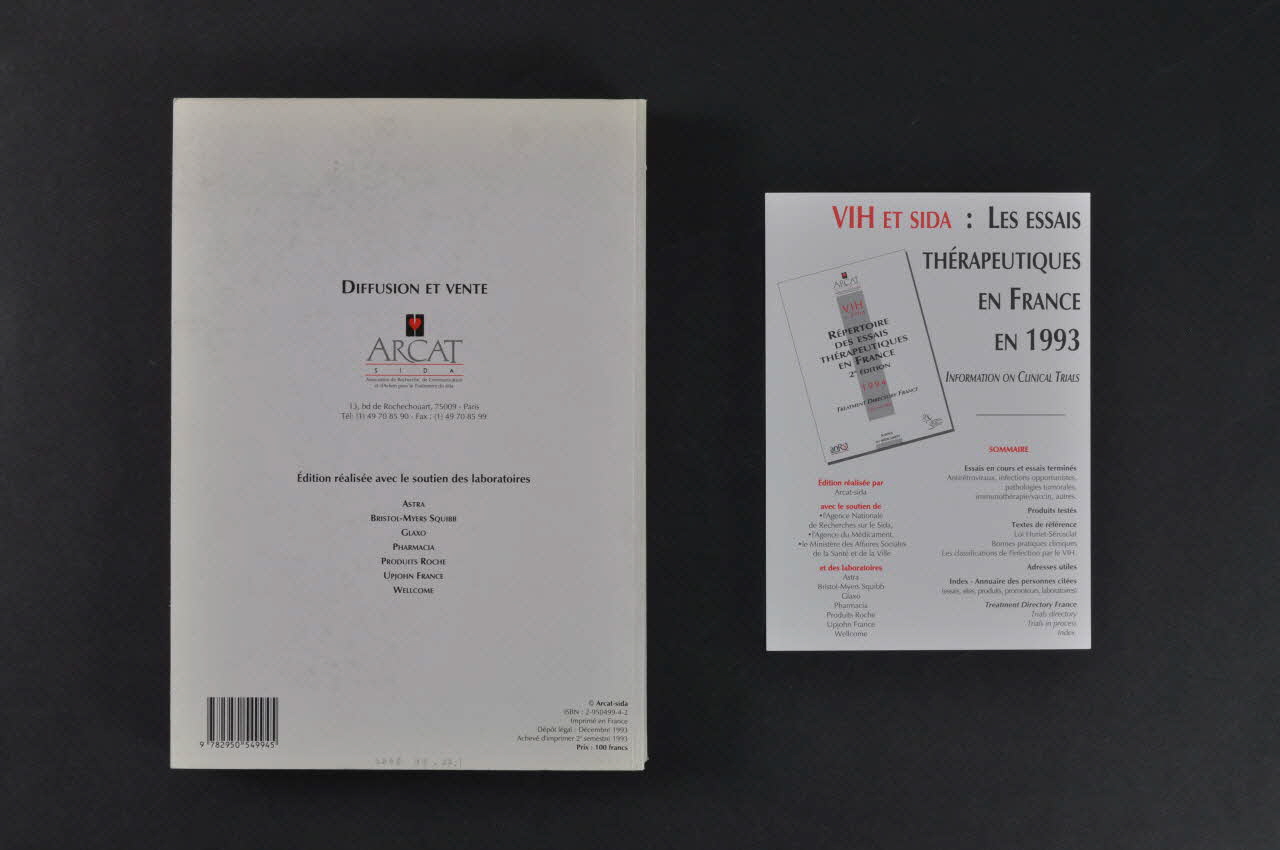 Au dos figurent les coordonnées d'ARCAT. Un carton rectangulaire, imprimé sur les deux faces, bon de commande du Répertoire des Essais Thérapeutiques, est glissé sous la couverture.Inscriptions