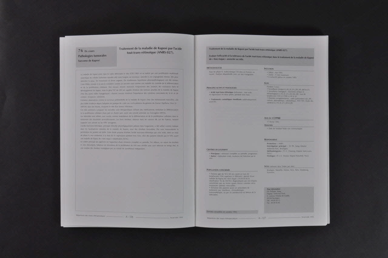 VIH / ET SIDA / REPERTOIRE / DES ESSAIS / THERAPEUTIQUES / EN FARNCE / 2e EDITION / 1994 / TREATMENT DIRECTORY FANCE / HIV AND AIDS (Titre sur la couverture.)- p.IX L'information sur les essais thérapeutiques (texte suivi de sa traduction en anglais) // - p.XIII 1993 : Recherches thérapeutiques en France sur l'infection par le VIH // - p.A1 à A 164 Fiches essais // - p.A2 Présentation des fiches essais rubriques : Nom et objectif de l'essai / Méthodologie / Principes actifs et Posologie / Critères de jugement / Population concernée / Inclusion / Suivi / Avis du comité consultatif de protection des personnes qui se prêtent à des recherches biomédicales (CCPPRB) / Analyses / Responsables ( Promoteur, Investigateurs, Méthodologiste / Indépendance du comité ) / Sites où est conduit l'essai. // - p.A5 Antirétroviraux // - p.A49 Infections opportunistes // - p.A113 Pathologies tumorales // - p.A133 Immunothérapie / vaccin // - p.A147 Autres // - p.B1à B 38 Fiches produits Rubriques : Propriétés et indications / Pharmacocinétique / Effets secondaires / Contre-indications / Interactions médicamenteuses / Présentation et posologie / Précautions d'emploi / Prix indicatif / Références / Pour information (laboratoire et contact) // - p.C1à C22 Annexes // - p.C3 Loi n°88-1138 du 20 décembre 1988 // - p.C9 Bonnes pratiques cliniques (CEE) // - p.C20 Classifications et définitions de l'infection par le VIH // - p.D1 à 12 Adresses utiles : Comités consultatifs de protection des personnes dans la recherche biomédicale / Centres d'informations et de soins de l'immunodéficience humaine / Structures institutionnelles / Coordonnées des personnes citées dans les fiches essais // - p.E1 à 56 Index : par essai / par produit / par site / par laboratoire / par promoteur // - p.F1 à F68 Treatment Directory France (traduction en anglais) // - p.F3 The clinical trials directory // - p.F5 Trials in process // - p.F61 Index (Sommaire.)Décor