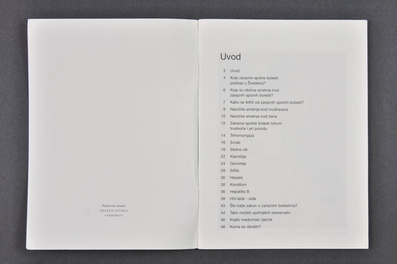 "Briga / Mala knjiga o zaraznim spolnim bolestima" (Prévention. Brochure sur les maladies sexuellement transmissibles) (en croate) (sur la couverture)KROATISKA // // Folkhalsointitutet // Box 27848 11593 Stockholm (au dos)Sommaire