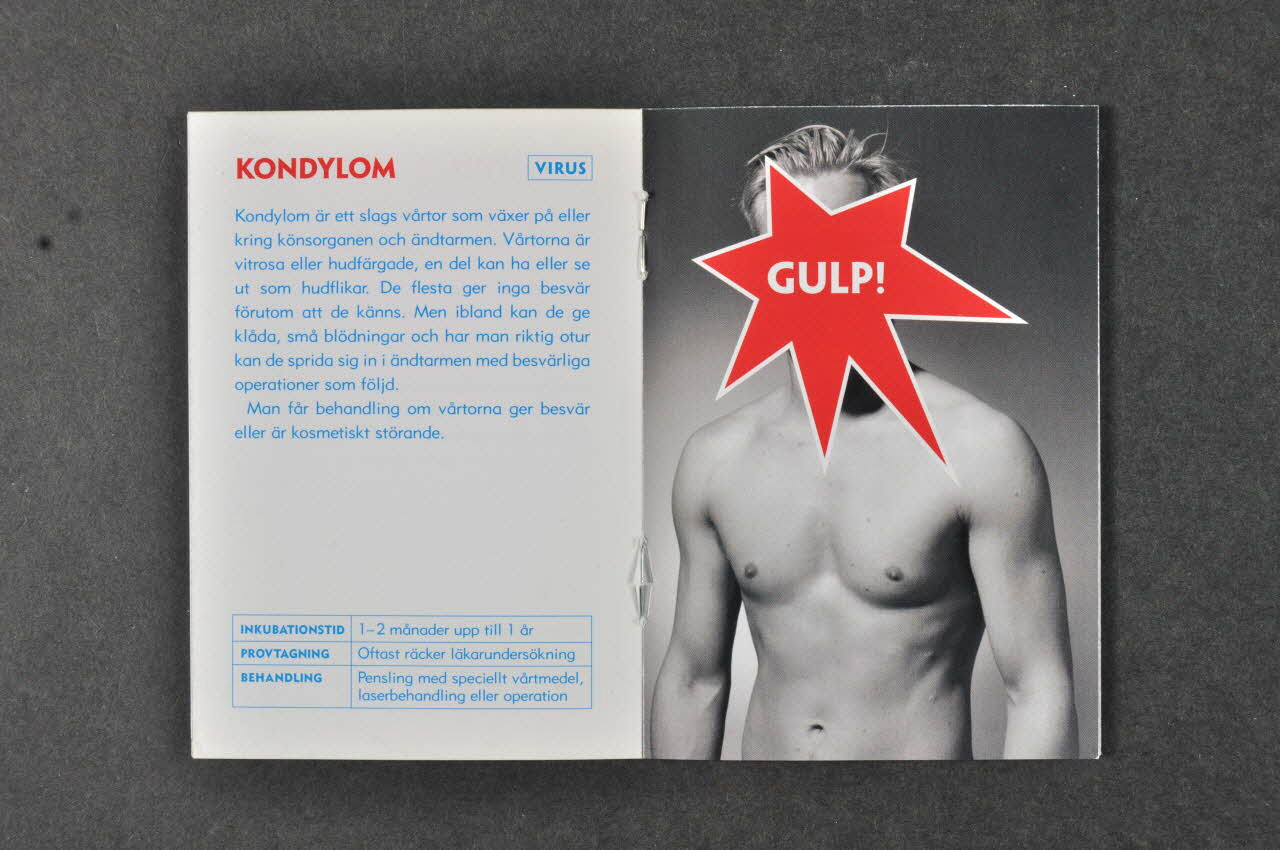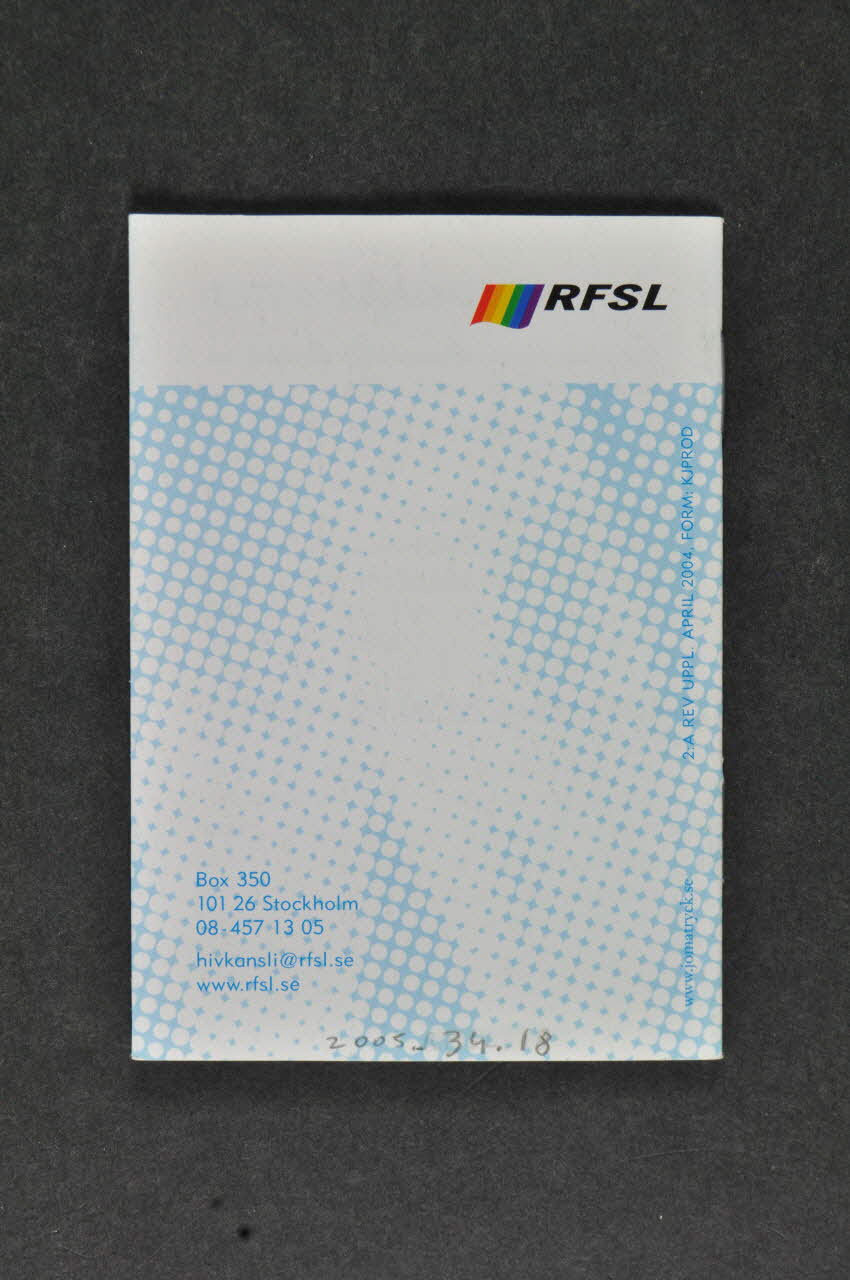 La couverture comporte un fond bleu avec des pointillés blancs sur laquelle se détache une étoile rouge à sept branches inégales au centre. Une inscription en lettres capitales blanches est au milieu de l'étoile. En haut de la page, se trouve un bandeau blanc comportant des petits caractères bleus. En bas à droite, en bleu, figure le nom de l'association. Le dos de la brochure comporte le même fond bleu avec des pointillés blancs. Un bandeau blanc avec à droite le logo de RFSL est situé en haut de la page, et en bas, à gauche, les coordonnées sont inscrits en bleu. L'intérieur de la brochure est doté d'inscriptions en bleu et rouge sur fond blanc. Trois photos de corps masculins nus avec une étoile rouge sur la tête, les fesses et le pénis avec des caractères blancs illustrent trois des pages intérieures de la brochure.Inscriptions