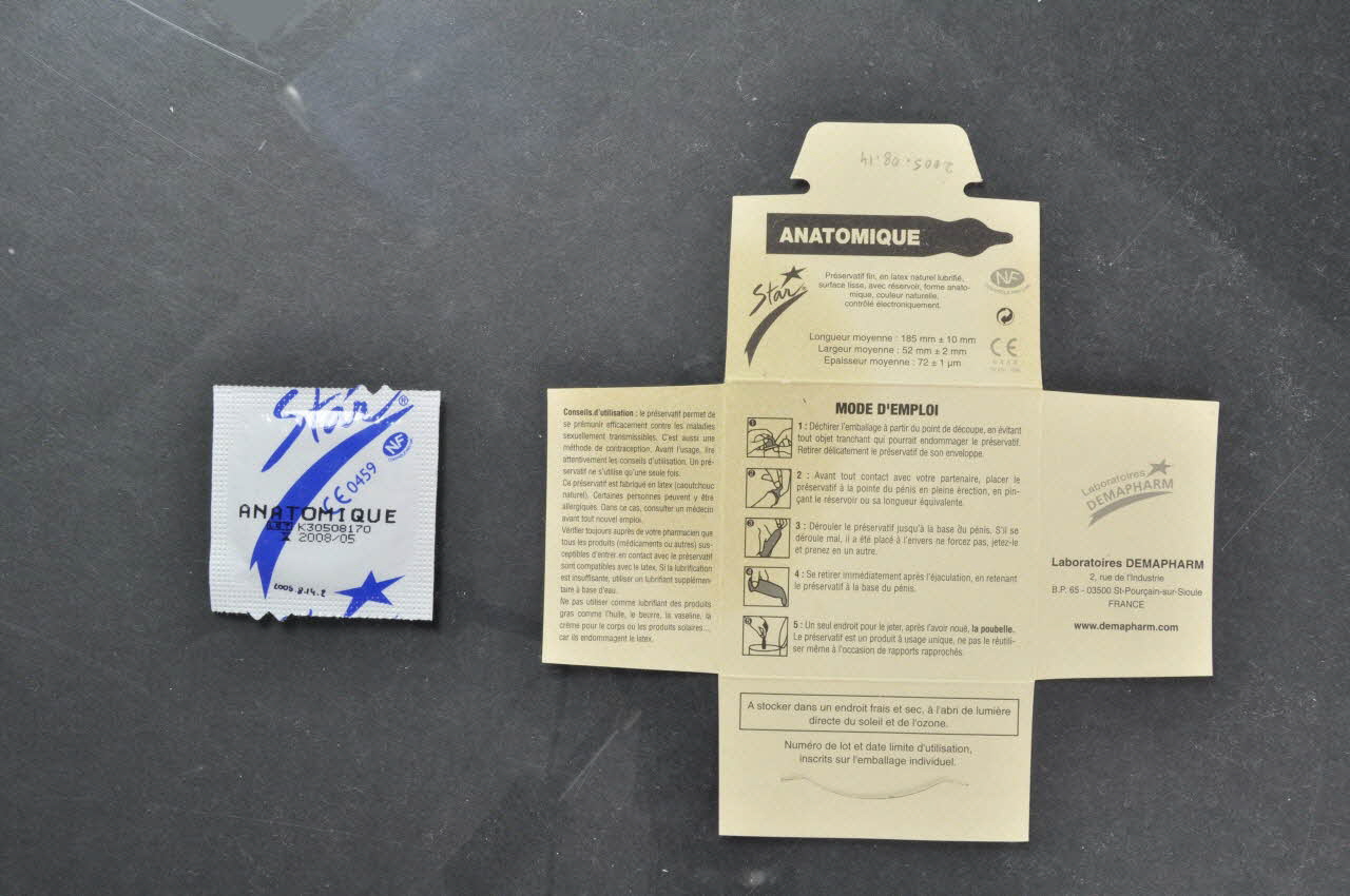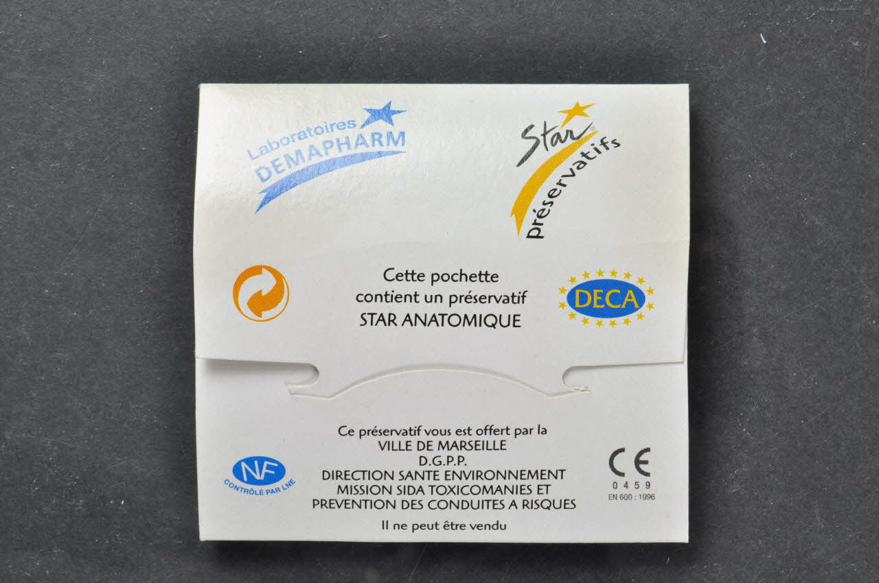 L'enveloppe est rangée dans une pochette carrée en carton noir, se fermant par une languette s'insérant dans une encoche. Sur l'avant se trouve une vue photographie de Marseille, surmontée du drapeau de la ville, encadré d'inscriptions blanches. Sur les rabats, on trouve plusieurs logos et inscriptions, ainsi que les coordonnées de Sida Info Service. A l'intérieur sont imprimés des conseils d'utilisation et cinq schémas en caractères noirs.Inscriptions