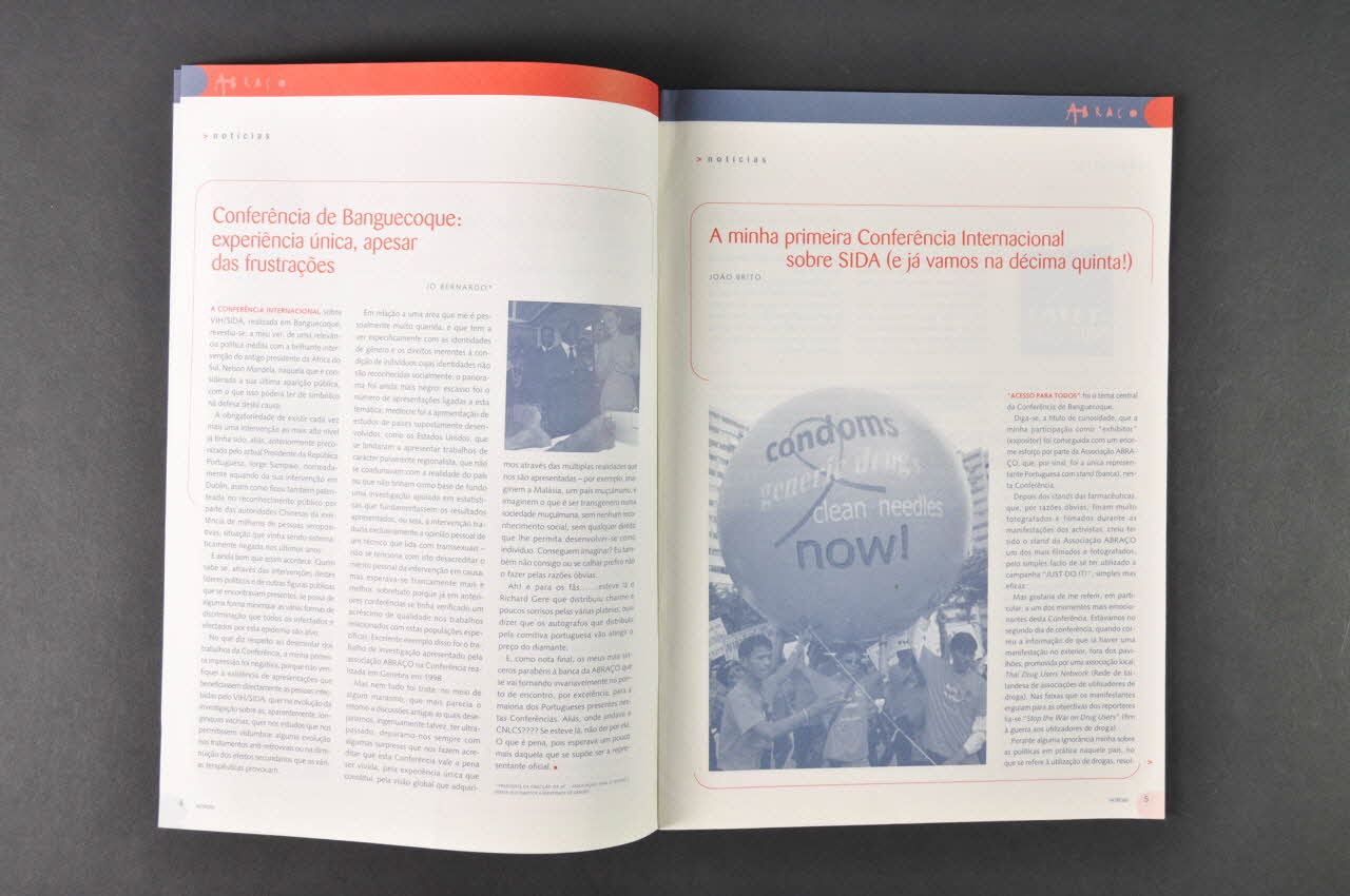 Sommaire en partie commenté : p. 2-17 Nouvelles - p.2 Sauver des vies, vivre dans la dignité (éditorial sur la conférence) Série de témoignages de participants - p.3 Réflexions de la Cité des Anges (Bangkok) (photo de Mandela) - p.4 Conférence de Bangkok : expérience unique malgré les frustations - p.5 A ma première Conférence Internationale du Sida (et nous sommes déjà à la XVème). photo : manifestants avec un ballon sur lequel est écrit : "condoms / generic-drugs / clean needles / now" - p.6 Richard Gere : il était là et travaillait comme nous tous (photo) - p.7 Discrimination en Afrique - p.8 et 10 Préservatif : just use it (photo du poster d'Abraço à la Conférence) - p.8 Vulnérabilité des femmes - p.9 Initiative globale sur les moyens de communication sociale : "The global media AIDS Initiative" - p.11 Discrimination sur les lieux de travail (présentation d'un poster présenté par des chercheurs portugais - p.12 Bilan depuis la dernière Conférence - p.14 Traitements : critique de la politique des laboratoires. Photo des manifestations devant les stands des laboratoires - p.19 Glossaire - p.19 Coordonnées d'Abraço à Lisbonne, Oeiras, Setubal, Gaia, Madère - p.20 Recette
