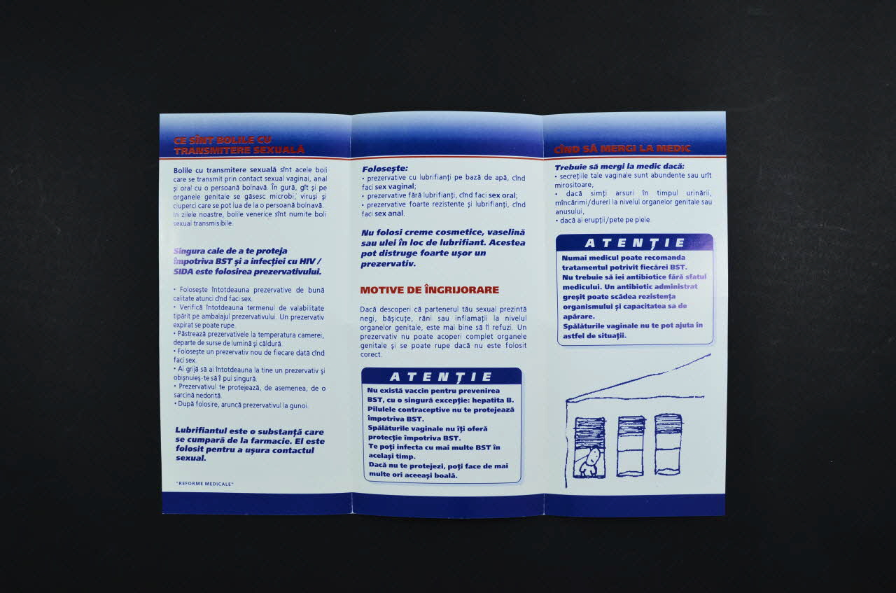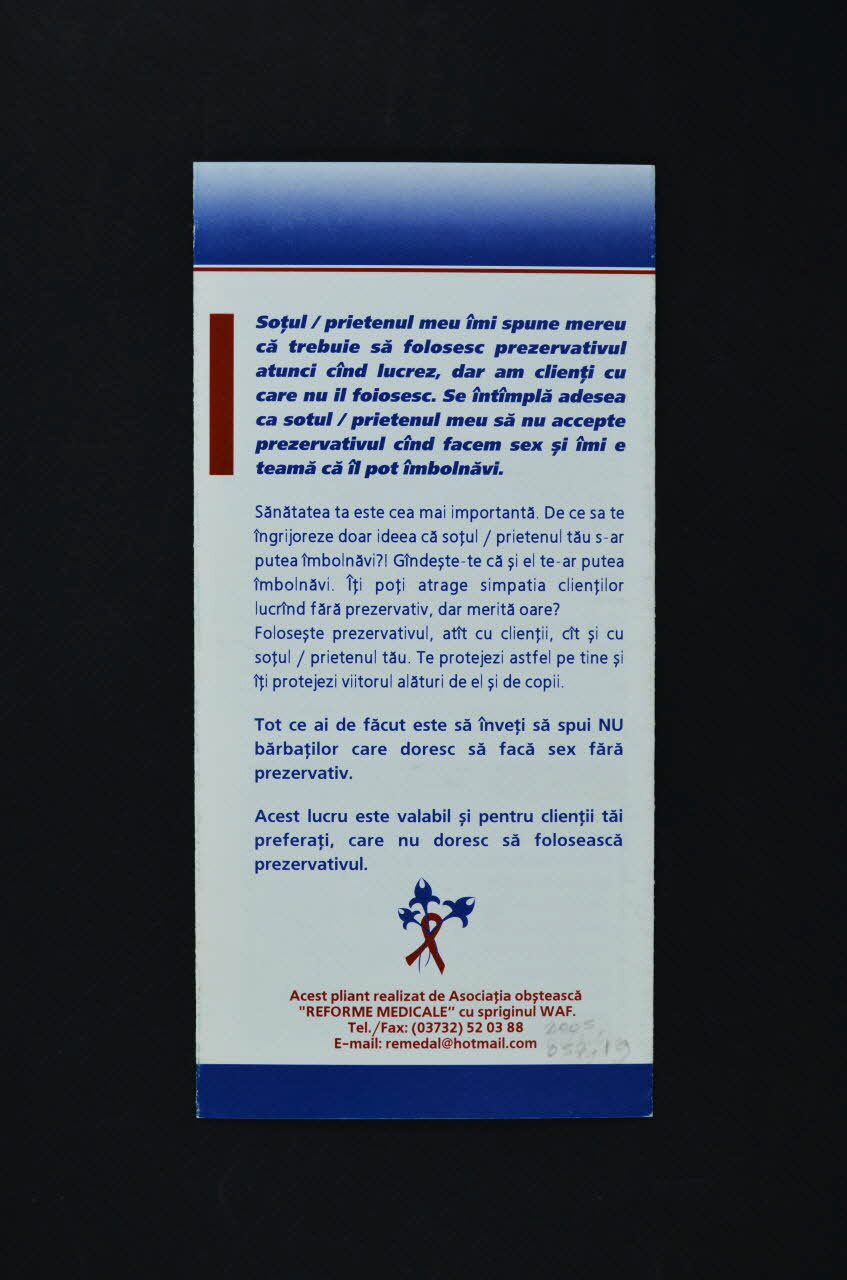 De forme rectangulaire, le dépliant en papier blanc est plié en trois. Il se lit verticalement. Il présente une bande bleue en partie inférieure et une bande dégradée du bleu au blanc, soulignée d'une ligne bordeaux, en partie supérieure.