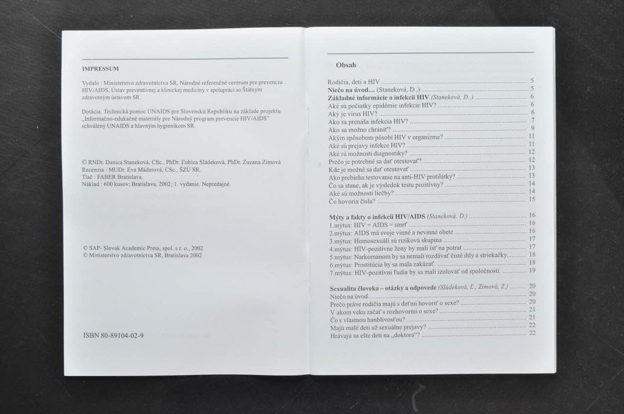 - Nieco na uvod // - Zakladné informacie o infekcii HIV : Aké su pociatki epidémie infekcie HIV ? / Akky je virus HIV ? / Ako sa prenasa infekcia HIV ? / Ako sa mozno chranit'? / Akym sposobom posobi HIV v organizme ? / Aké su prejavy infekce HIV ? / Aké su moznosti diagnostiky ? / Preco je potrebné sa dat' otestovat ? / Kde je mozné sa dat' otestovat' / Ako prebieha testovanie na anti-HIV protilatky ? / Co sa stane, ak je vysledok testu pozitivny ? / Ake su moznosti liecby ? / Co hovoria cisla ? // - Myty a fakkty o infekcii HIV/AIDS : 1.mytus : HIV=AIDS = smrt' / 2.mytus : AIDS ma svoje vinné a nevinné obete / 3.mytus : Homosexuali su rizikova skupina / 4.mytus : HIV-pozitivne zeny by mali ist' na potrat / 5.mytus : Narkomanom by sa nemali rozdavat cisté ihly a striekacky / 6.mytus : Prostitucia by sa mala zakazat / 7.mytus : HIV-pozitivni l'udia by sa mali izolovat' od spolocnosti // - Sexualité cloveka - otazkkky a odpovede : Nieco na uvod / Preco prave rodicia maju s det'mi hovorit' o sexe ? / V akom veku zacat's rozhovormi o sexe ? / Co s vlastnou hanblivost'ou? / Maju male deti uz sexualne prejavy ? / Hravaju sa este deti na 'doktora" ?/ Je normalne, akk sa vypytuju uz malé deti ? / Ako mu to mam povedat, aby tomu rozumelo ? / Co robit' v chulostivych situaciach ? / Maju deti vediet, co je za dverami spalne ? / Ake informacie ma diet'a dostat' pred pubertou ? / Preco sa nechce moje diet'a bozkkavat' pri luceni ? / Ako mam diet'a chranit' pred nebezpecenstvom zneuzivania ? / Je môj syn dievcensky pupok ? / Co nas caka s pubert'akom ? / Co s hanblivost'ou diet'at'a ?/ Preco sa diet'a prestalo pytat' ? / Preco nechce pocuvat' ? / Musim sa zmierit's tym, ze dcéra nosi vyzyvavé oblecenie ? / Ako mam reagovat' na erotické obrazky v detskej izbe ? / Ako mam vel'ké diet'a chranit' pred nebezpecenstvom ? / Ma diet'a pravo na sukromie ? / Nechodi este s dievcat'om, je to normalne ? / Plati toto vsetko aj pre postihnuté deti ? // - Deti a riziko infekcie HIV : Ako mam dosiahnut', aby nase diet'a bolo zodpovedné pri vybere partnera ? / Ako riesit' to, ked prvy vzt'ah nie je idealny ? / Ako sa mame vyrovnat's homosexualitou nasho diet'at'a ? / Ako spoznam, ze moje diet'a zijz rizikovym zivotnym stylom ? / Co ak diet'a berie drogy - mozem mu pomoct' chranit' sa pred HIV ? / Ako predchadzat' promiskuite a prostitucii ? / Ma HIV pozitivneho kamarata, co s tym ? / Ako sa vyrovnat's infekciou HIV v rodine ? / Ako pomôct' HIV-infikovanému diet'at'u ? // - Slovnik // - Linky dôvery (imprimé en noir sur blanc, sur la 2 eme page)Auteur