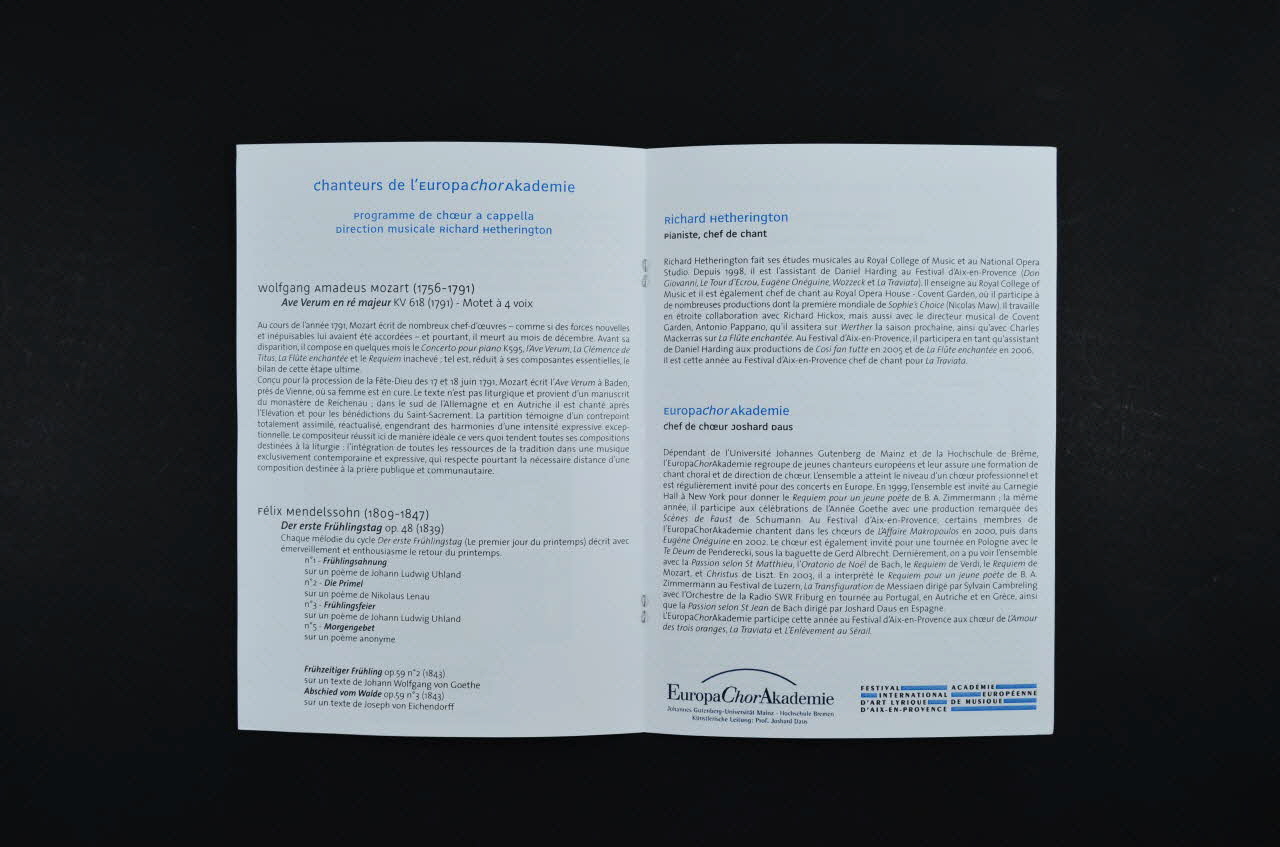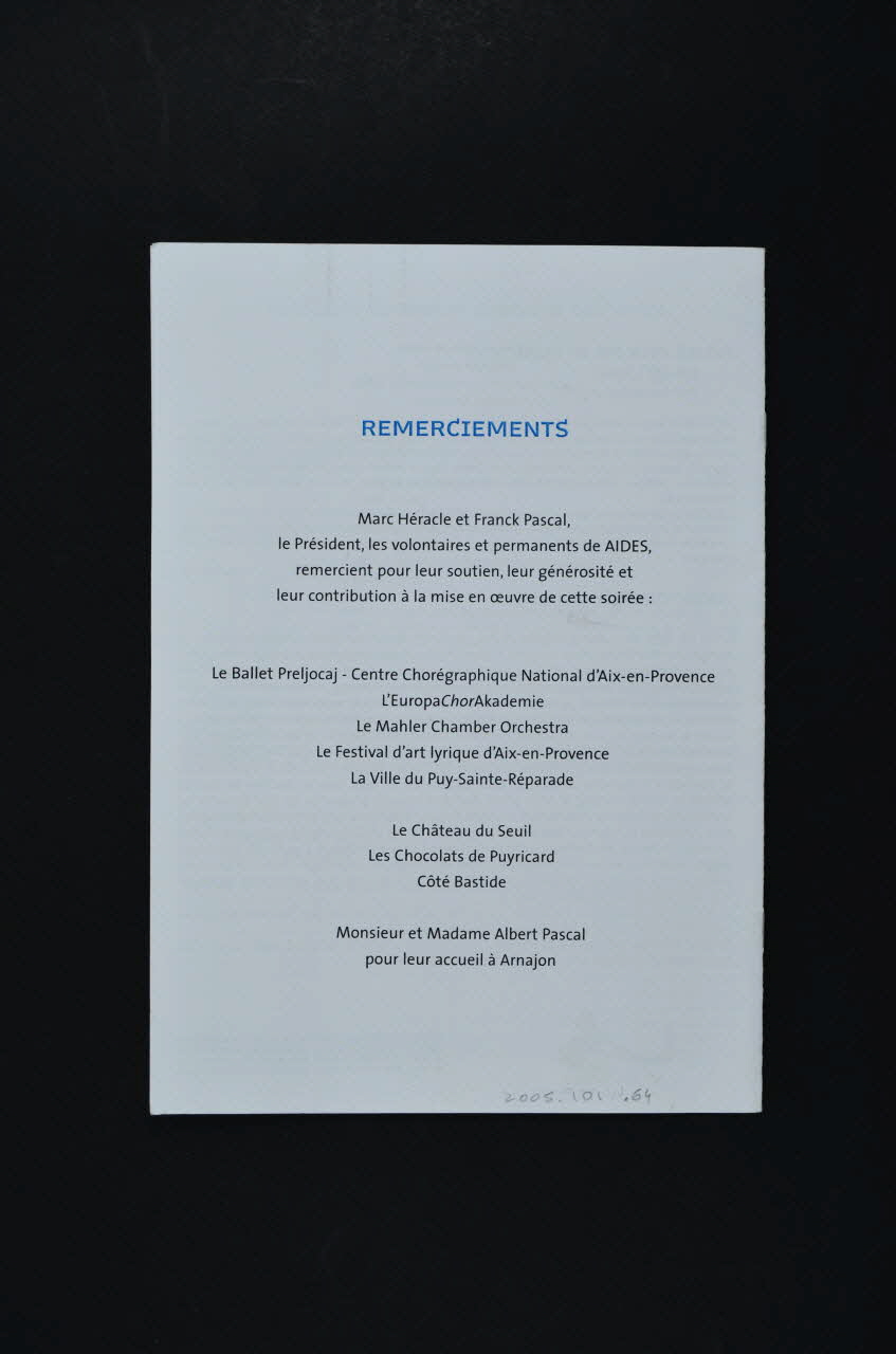 Ballet Preljocaj // Chanteurs de // l'EuropaChorAkademie // Choeurs du Festival d'Aix-en-Provence 2004 // Musiciens du // Mahler Chamber Orchestra (inscription en bleu sur fond blanc, au centre), sur la couvertureSoirée de soutien // à l'association de lutte contre le sida // AIDES (inscription en noir en bas de la page au centre), sur la couvertureLogo