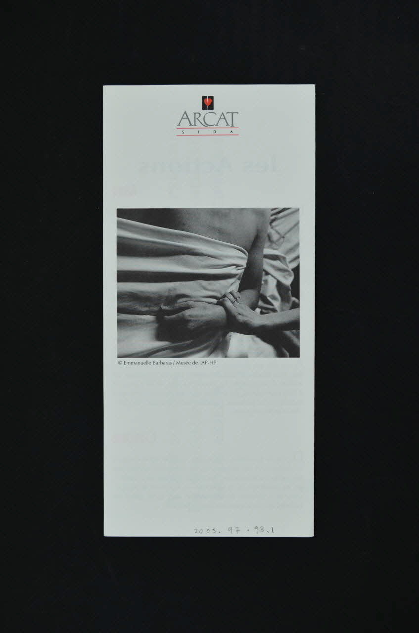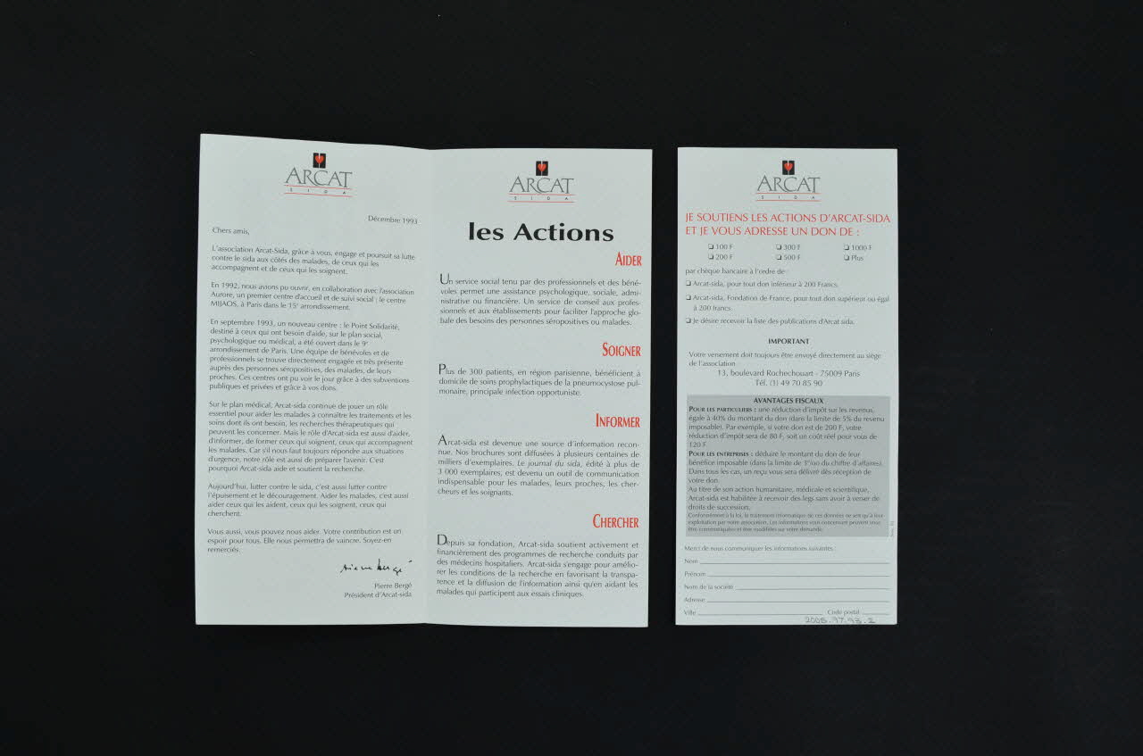 SIDA // Aidez-nous à aider // Nous aidons les malades // nous aidons la recherche // nous vous informons (inscription en rouge et en noir), sur la couvertureVotre soutien, même modeste est précieux. // En soutenant les actions d'Arcat-Sida, vous // nous aidez à aider et vous participez à la // lutte contre le sida. (inscription en noir sur fond blanc sur le feuillet mobile (.2)), rectoLogo