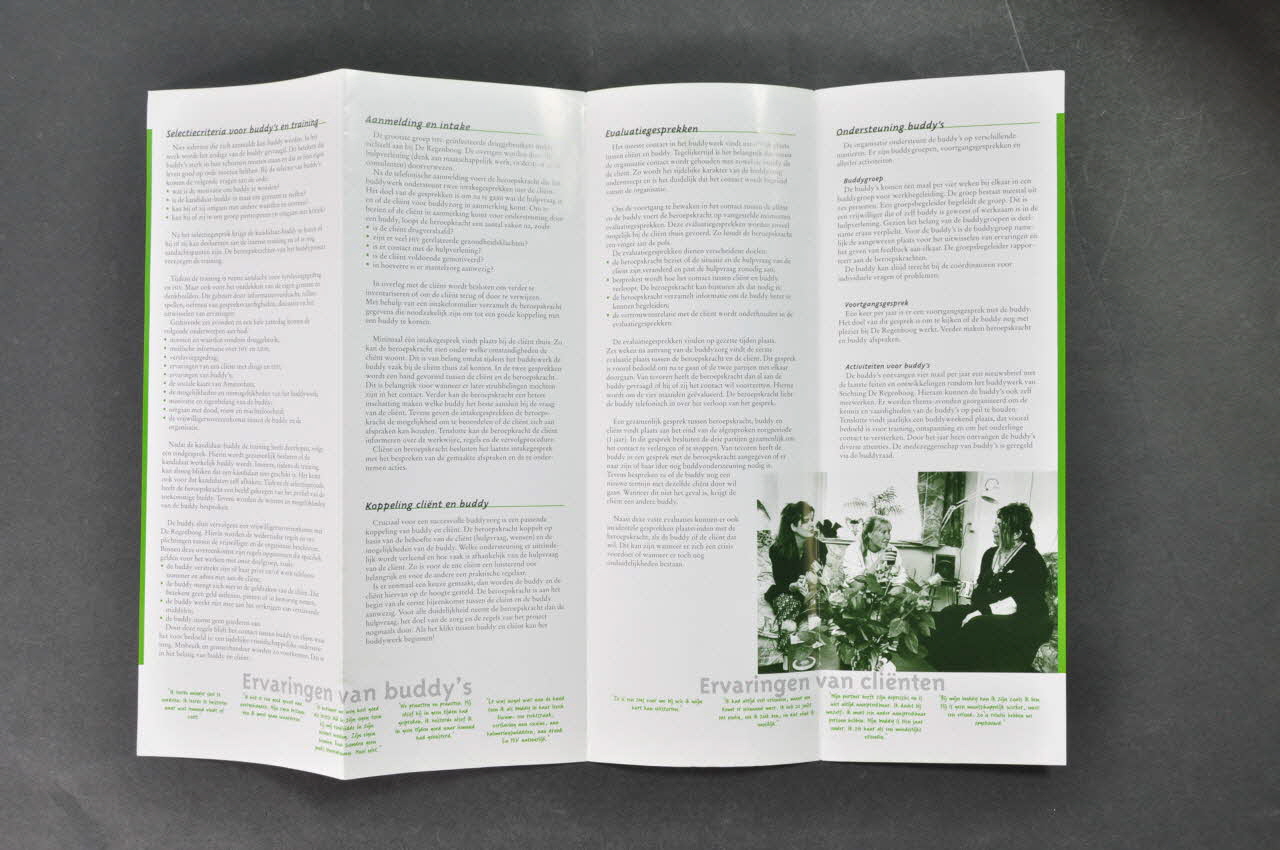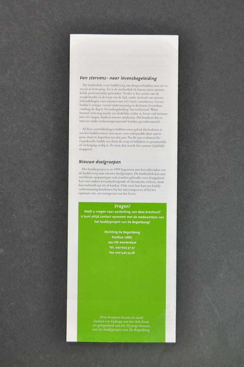 Résumé - Buddyzorg voor drugsverslaafden met HIV ("Buddys pour des usagers de drogue séropositifs) (en blanc sur fond vert) - Taken buddy - Selectiecriteria voor buddy's training - Aanmelding en intake - Koppeling cliënt en buddy - Ervaringen van buddy's (en caractères verts) - Ervaringen van cliënten (en caractères verts) - Evaluatiegesprekken - Ondersteuning buddy's - Van stervens - naar levensbegeleiding - Nieuwe doelgroepen - Coordonnées de Stichting De Regenboog (en blanc sur vert)