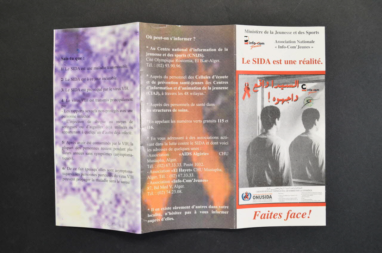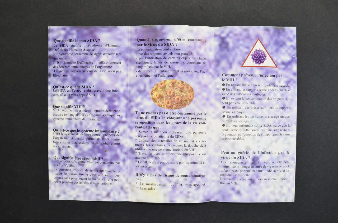 La couverture comporte un fond blanc avec des inscriptions en haut et en bas. Au centre, dans un encadré de rouge, une photographie noir et blanc représente un homme de dos se regardant dans une glace dans laquelle apparaît son dos. Le dos du dépliant comporte une inscription en blanc sur un fond brun avec un grand ruban rouge en sous impression. L'intérieur du dépliant contient un fond violet tacheté avec un texte en noir. Les feuillets 2 et 3 sont dotés d'une image représentant le virus du sida.Inscriptions