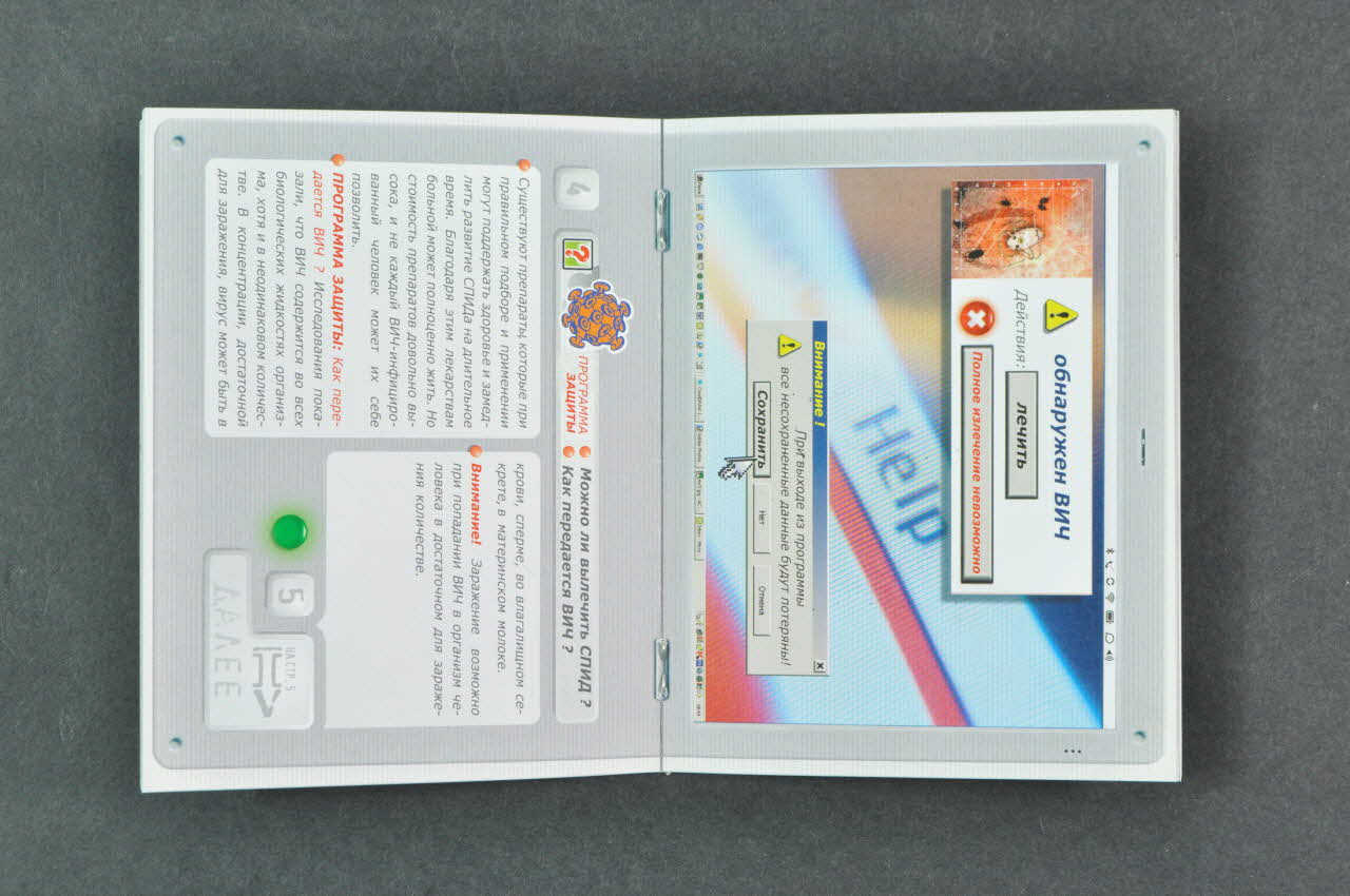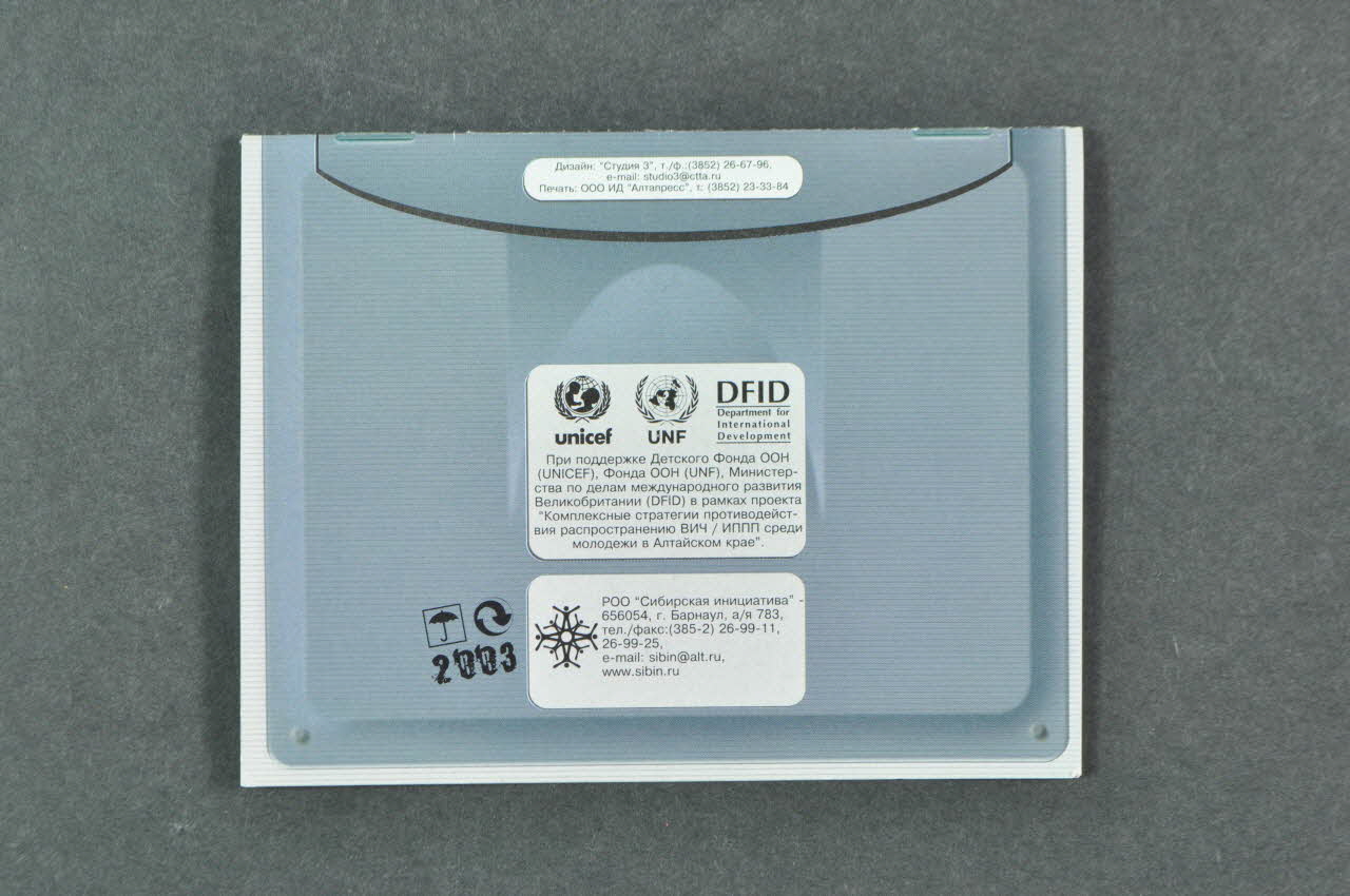 En bas, au centre, il y a une vignette imitant une étiquette bleue avec une inscription en cyrillique et une adresse internet. Le dos a le même fond gris avec de haut en bas, trois étiquettes en cyrillique avec les coordonnées de l'association. A l'intérieur, le fond d'écran et le menu reprennent en petit l'illustration de l'affiche 2004.224.01 : jeunes garçons et filles dans un style Manga présentés comme un film sur écran d'ordinateur, avec à gauche, le menu. Les pages suivantes présentent 6 autres fonds d'écran correspondant à différentes rubriques. On trouve des adresses utiles en dernière page.Inscriptions