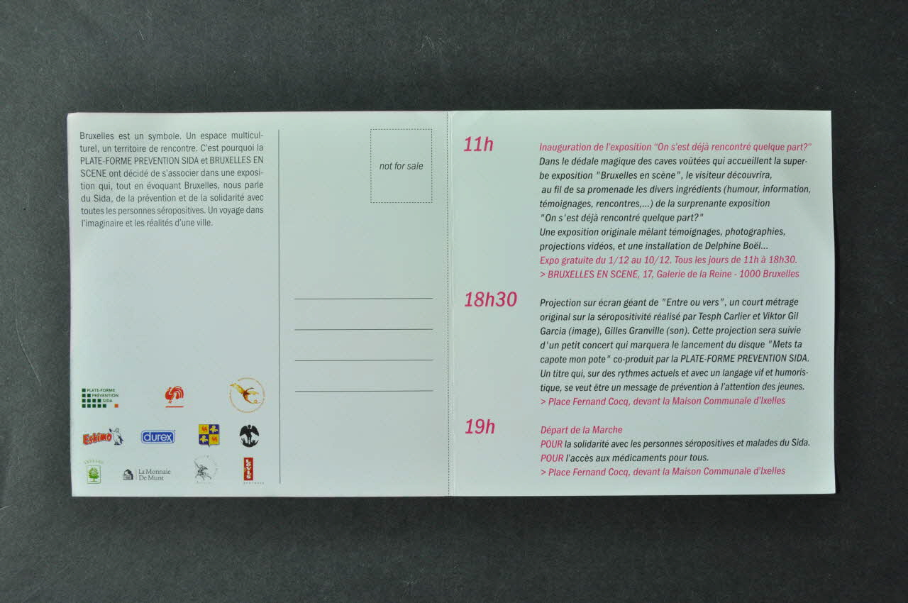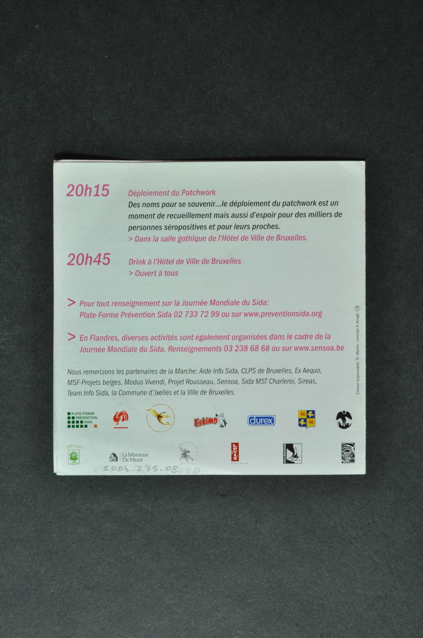 Aide Info Sida, CLPS de Bruxelles, Ex Aequo, MSF-Projets belges, Modus Vivendi, Projet Rousseau, Sensoa, Sida MST Charleroi, Sireas, Team Info Sida, la commune d'Ixelles et la Ville de Bruxelles. (à gauche // et au dos), versoLogo, nom d'association