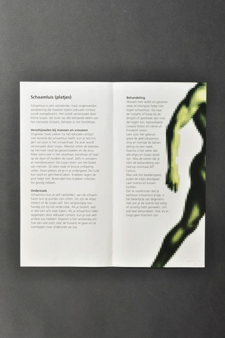 Sur la couverture verte on peut voir en haut le titre, sur le côté le logo de l'association et en bas son adresse internet. Une image très pixellisée illustre cette couverture. A l'intérieur se trouve un texte en lettres noires sur un fond blanc, il présente une maladie sexuellement transmissible. Le dos est vert avec des informations sur l'association.Inscriptions