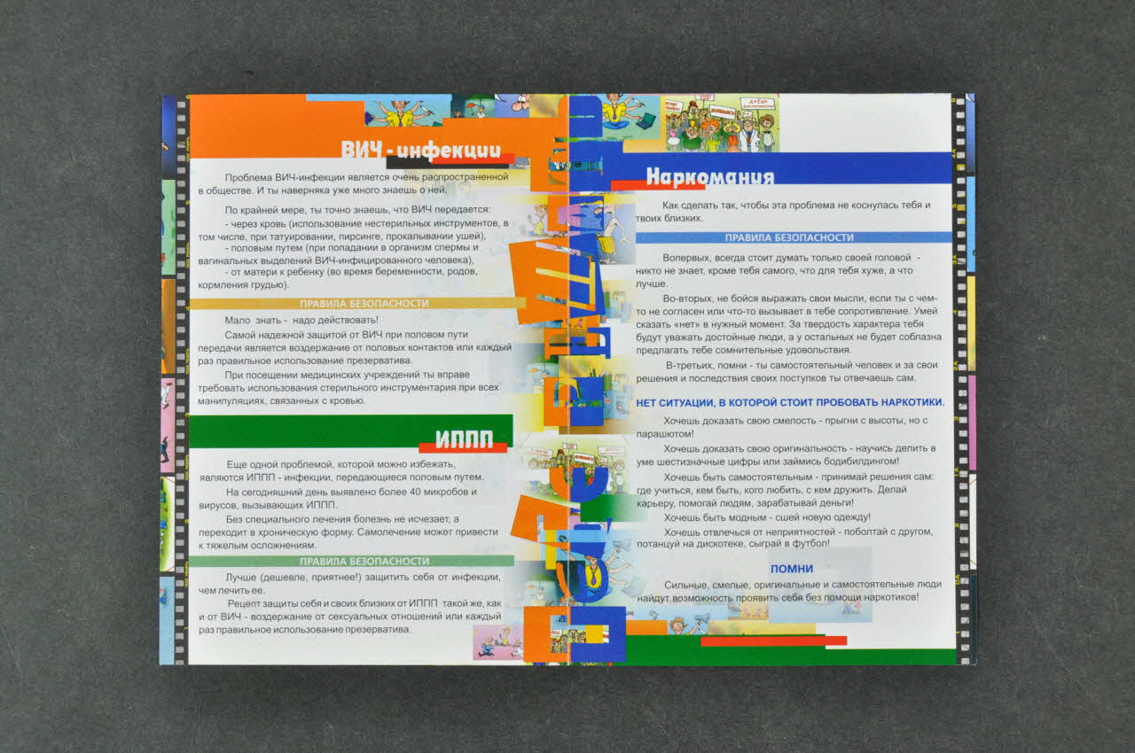 Les deux volets intérieurs sont séparés au niveau du pli central par les dessins de la pellicule en sousimpression avec le titre repris en surimpression à la verticale. La pellicule de film est reprise à la verticale le long des bords externes de chaque feuillet. Les volets se composent sur un fond principalement blanc d'un texte en caractères cyrilliques noirs, divisés par des sous-titres en caractères cyrilliques "fantaisie" blancs sur fond soit orange, vert ou bleu.