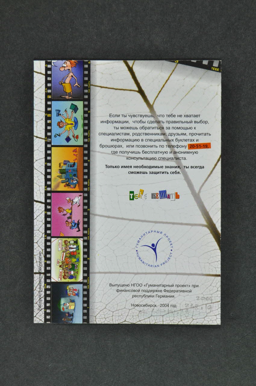 A droite, on trouve un texte en caractères cyrilliques noirs et le titre dans la même typographique que sur la couverture. Dans la partie inférieure, le nom et le logo de l'association sont inscrits.