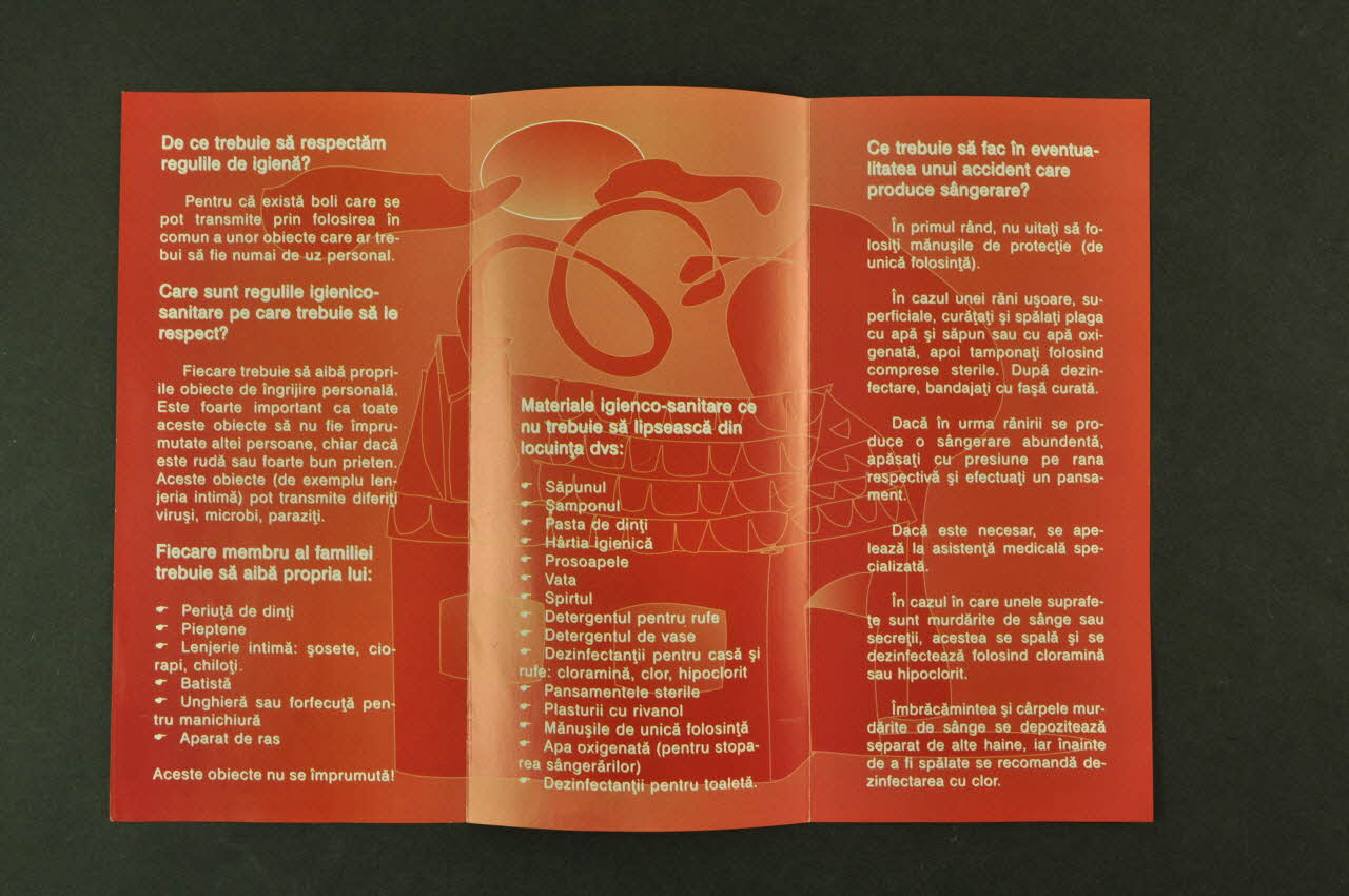 Dépliant réalisée dans le cadre du projet : Education sanitaire pour les enfants et les adolescents séropositifs ou malades du sida et leurs familles, conduit par la Fondation Romanian Angel Appeal. Les textes expliquent : - la nécessité de ne pas mettre en commun les objets d'hygiène personnels : exemples d'objets comme lingerie intime, objets de manucure, rasoir.... - le matériel que l'on peut mettre en commun comme savon, dentifrice, détergents, désinfectants, pansements stériles, eau oxygénée..... - Conduite à tenir lors d'un accident avec production de sang - se laver les mains, les dents....