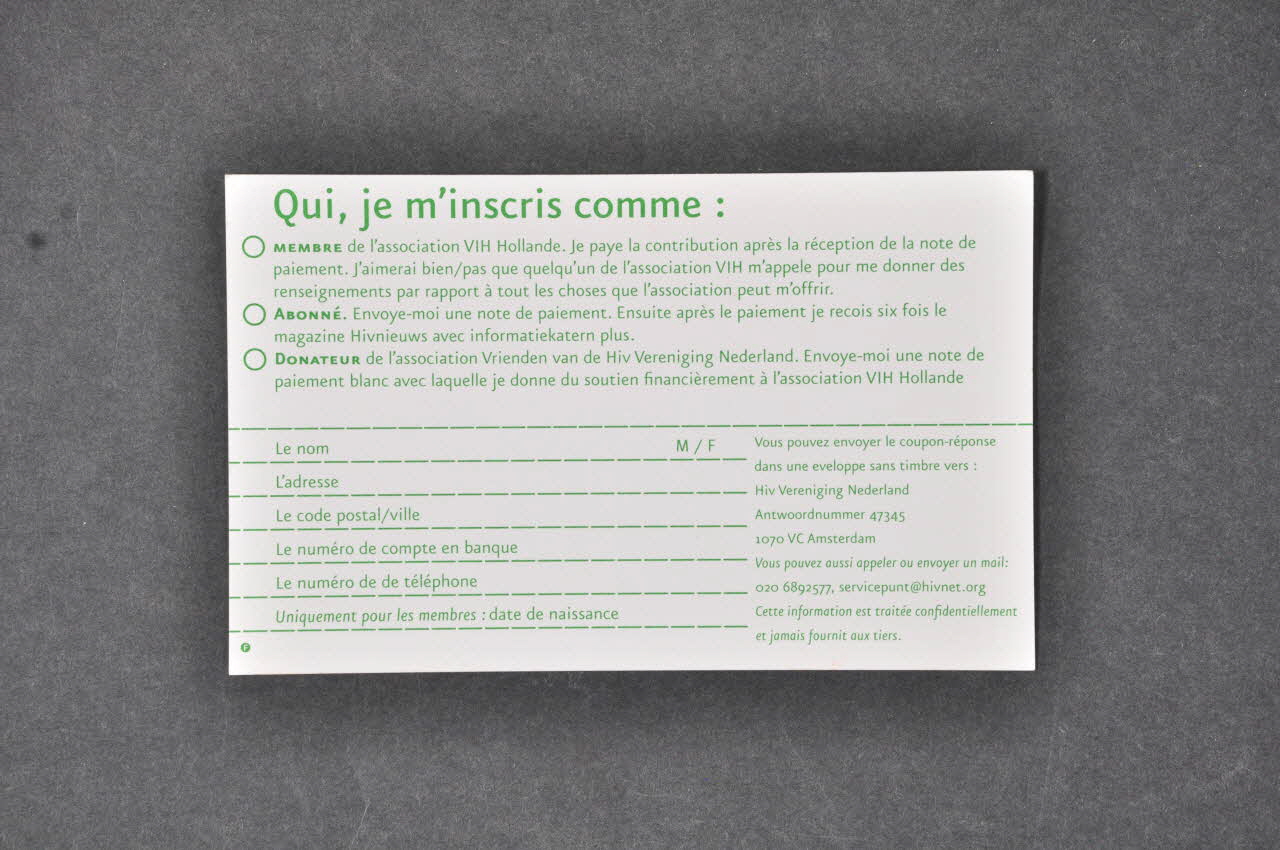 Hiv Vereniging Nederland // Antwoordnummer 47345 // 1070 VC Amsterdam // [...] // 020 6892577, servicepunt@hivnet.org (Dans l'angle inférieur droit en caractères verts), versoDécor
